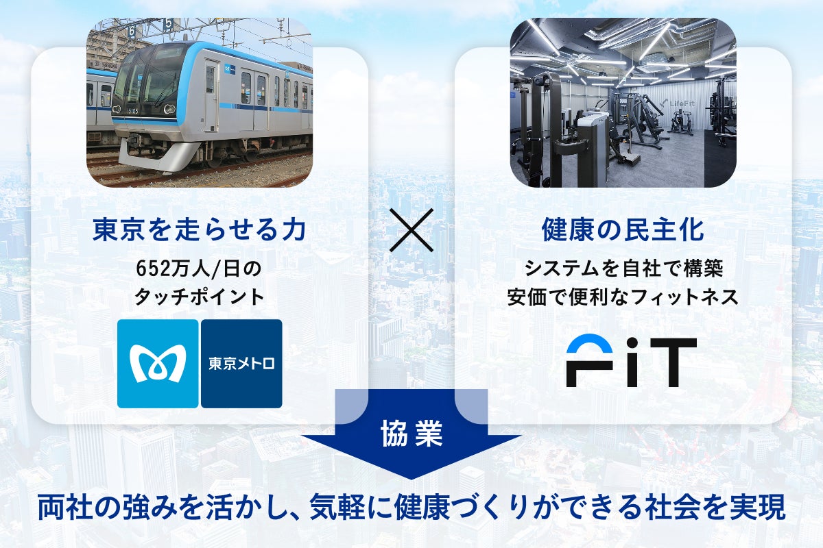 こうした背景を踏まえ、今回、東京メトロはFiTが提唱する「健康の民主化」の必要性に共感し、両社でフランチャイズ契約を締結、1号店として「LifeFit 葛西駅店」を開業する運びとなりました。今後は、両社の強みを活かし、気軽に健康づくりができる社会を常識とすることで、「健康の民主化」の実現に向けた取り組みをさらに推進してまいります。詳細は下記をご確認ください。