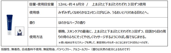 目もとのコリをひんやりほぐし、ハリのある明るい目もとへ導くロールオンタイプの目もと美容液。紫外線ダメージをケアする保湿成分「ハーバルチャージ複合エキス」をはじめ、肌をなめらかに整えハリを高める成分や透明感を引き出す保湿成分配合。
