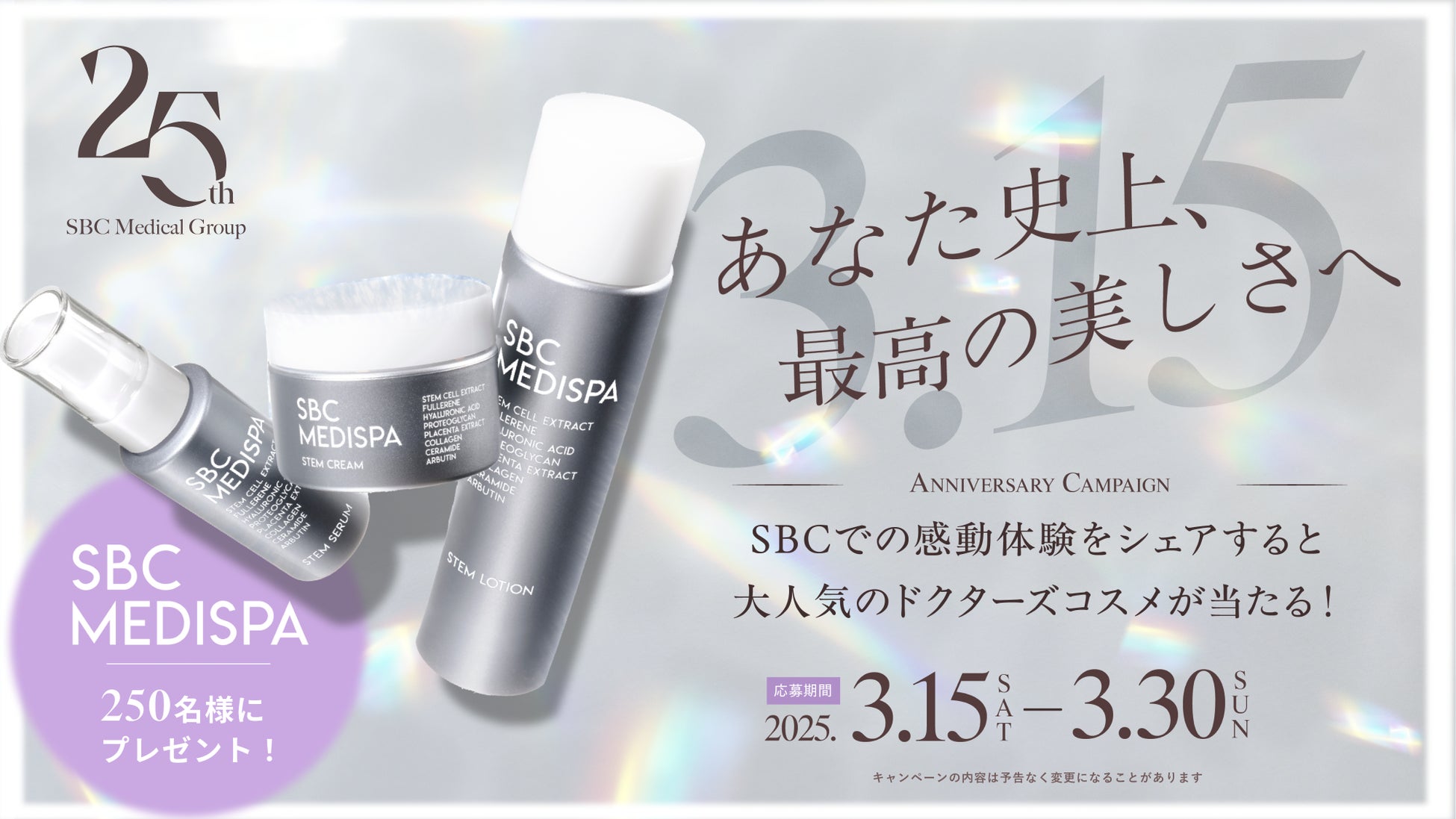 湘南美容クリニックは、2025年3月15日(土)に創業25周年を迎えました。この節目を記念し、250名様にドクターズコスメをプレゼントするXキャンペーンを実施しております。