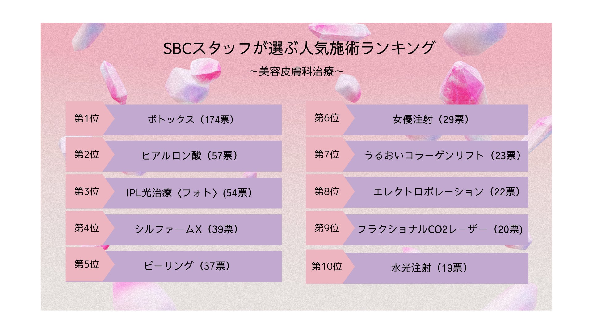 SBCメディカルグループホールディングス(本社:米国カリフォルニア州、CEO:相川佳之)が経営支援を行う湘南美容クリニックは、創業25周年を機に、美容医療の魅力をより多くの方に身近に感じていただくため、本企画を実施しました。近年、美容皮膚科治療は、エイジングと向き合いながら美しさを育む手段として、多くの方に選ばれています。こうした背景を踏まえ、美容医療の最前線で活躍するスタッフを対象にアンケート調査を実施し、550名から得た回答をもとに、効果を実感した美容皮膚科施術の上位10施術をランキング形式で発表します。