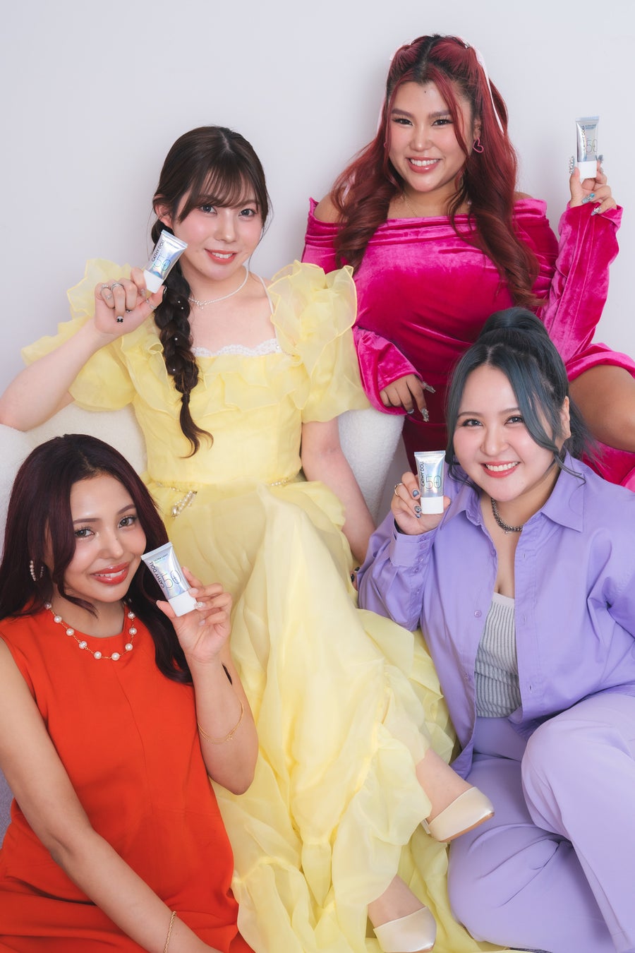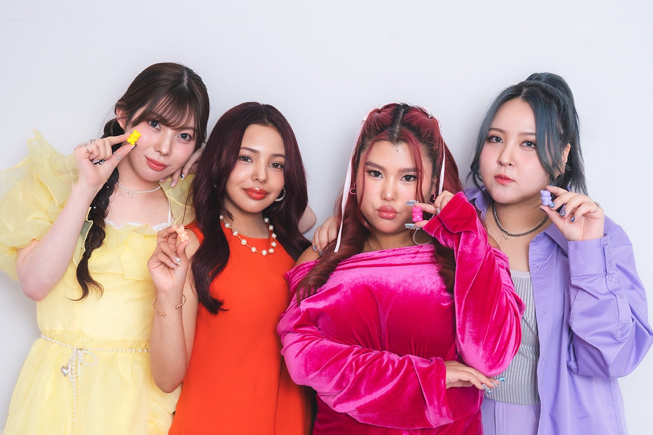 (画像左から)聖秋流さん:08 SUNKISS SALMON(サンキスサーモン)/イエローちゃん・momohahaさん:06 JELLY COLA(ジェリーコーラ)/オレンジちゃん・JESSICAさん:01 CANDY PINK(キャンディーピンク)/ピンクちゃん・大内アイミさん:02 REDLIPOP(レッドリポップ)/紫ちゃん