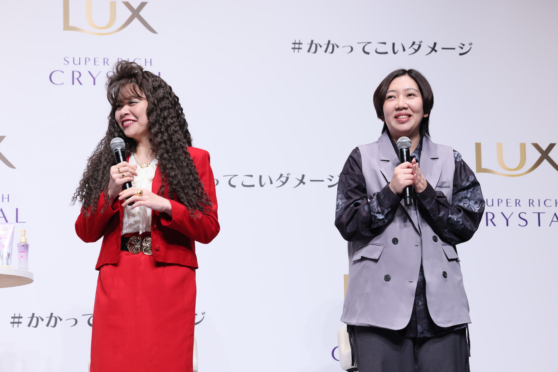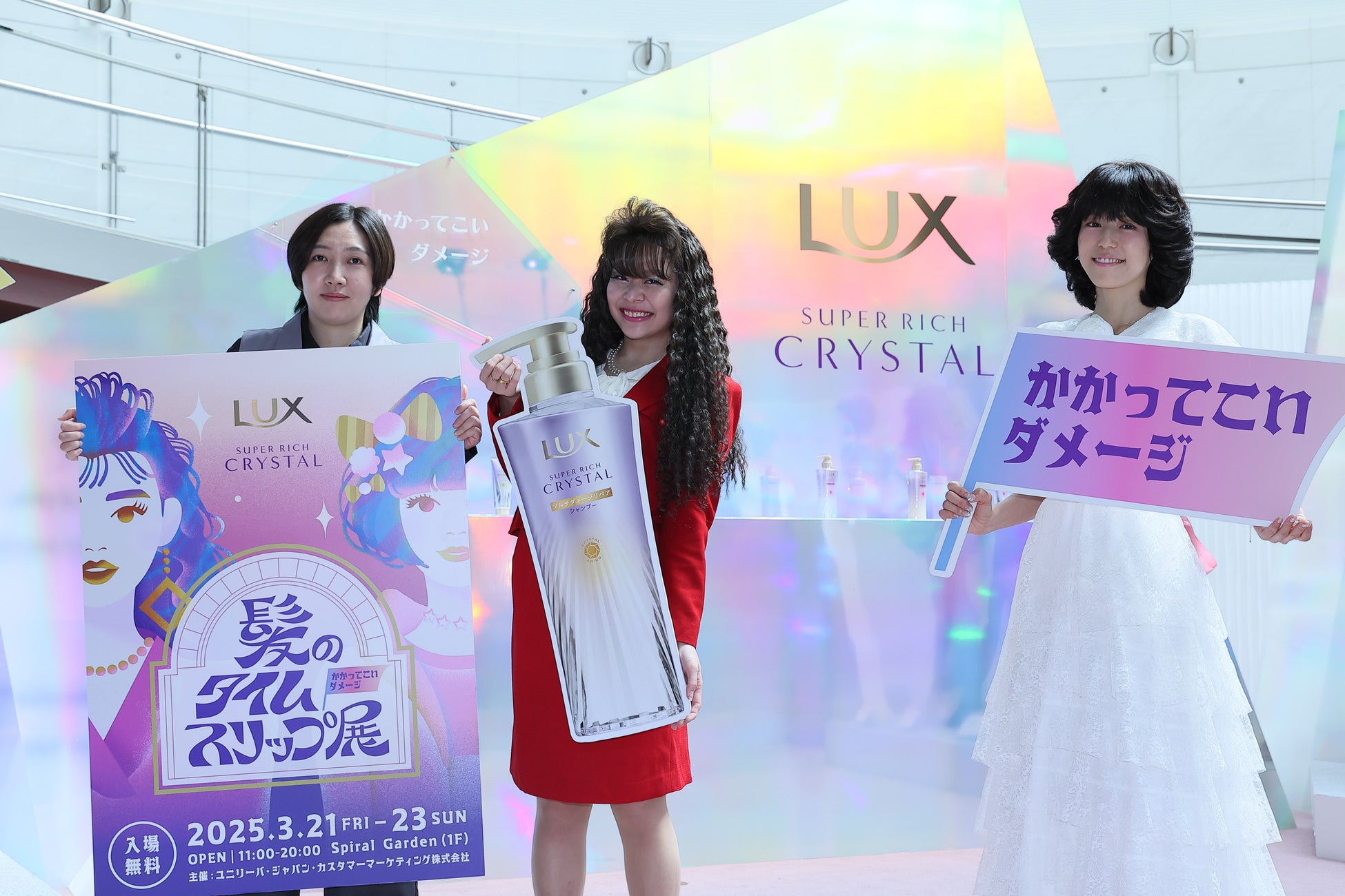 ユニリーバ・ジャパン・カスタマーマーケティング株式会社(本社:東京都目黒区、代表取締役社長:エド・ブリオラ)が展開するトータルビューティーケアブランド「LUX(ラックス)」は、約3年ぶりとなる新シリーズ「ラックス スーパーリッチクリスタル シリーズ」の発売を記念した、時代を象徴するトレンドヘアを集結させた展示&体験型イベント「髪のタイムスリップ展」のオープニングイベントとなる「LUXスーパーリッチクリスタル『髪のタイムスリップ展』PRイベント」を3月20日(木)に開催しました。人気コンビ芸人のエルフさんと、人気タレントの若槻千夏さんをゲストとしてお招きし、お二人には「髪のタイムスリップ展」の目玉コンテンツの時代を象徴するヘアスタイルへの“なりきり変身体験”を通じて、エルフ荒川さんはバブリーヘアに、若槻さんは昭和アイドルヘアに変身してご登場いただきました。「髪のタイムスリップ展」は表参道のスパイラルガーデン(1F)にて、3月21日(金)から3月23日(日)まで開催しています。