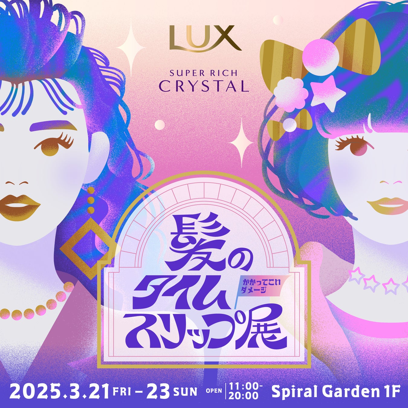 3月10日(月)より全国での店頭発売が開始されている新製品「ラックス スーパーリッチクリスタル シリーズ」は、日々蓄積される髪の7大ダメージ※1を集中補修し、ダメージを気にせず好きなことに全力で取り組み、輝く毎日を楽しんでいただくために、「かかってこい、ダメージ」をコンセプトに開発されました。ダメージを受け入れて恐れず、自分の信念に従って思いのままに挑戦していく芯のある女性たちの姿を思わせるこのコンセプトにちなみ、ダメージと向き合いながら自分らしい髪型に挑戦してきた時代のトレンドヘアを集めた展示会と、ダメージを恐れずに新しい自分へ挑戦するきっかけづくりとなる“ヘアスタイルなりきり体験”を企画しました。本展示会を通じて、髪のダメージに立ち向かいながら挑戦してきた歴史を楽しんでいただくとともに、髪のダメージを気にせず、さまざまなヘアスタイルを楽しむきっかけとなることを目指しています。