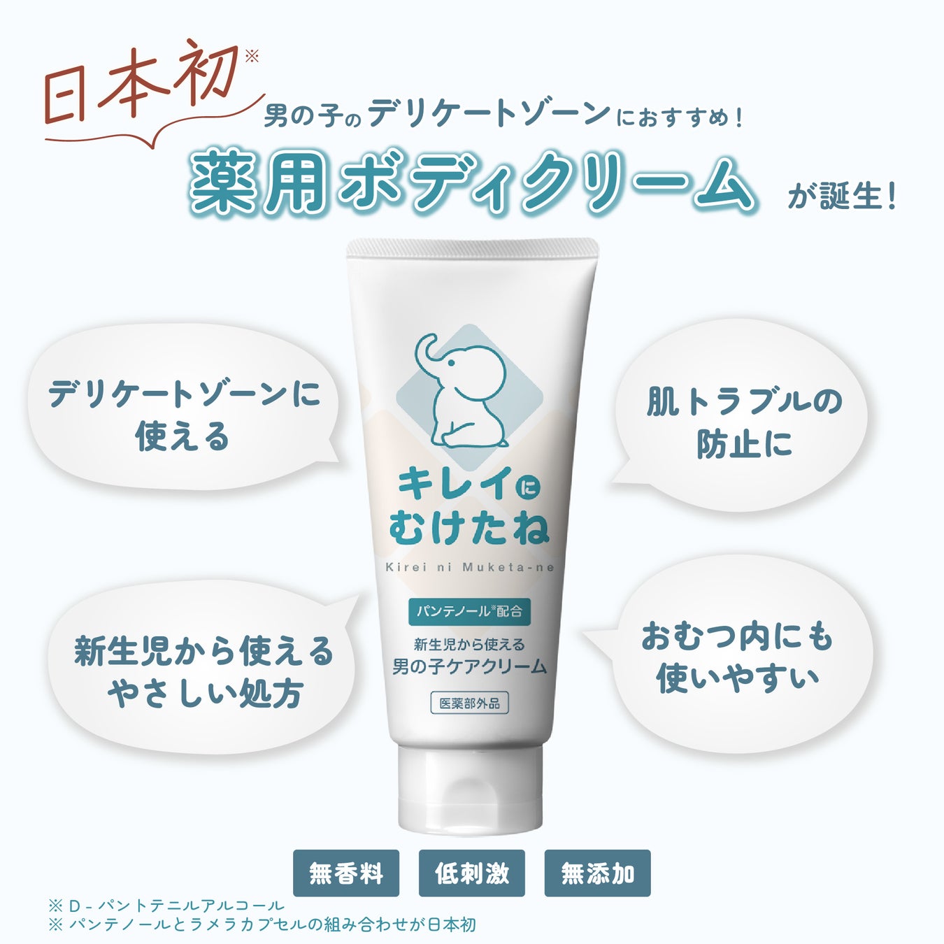 『キレイにむけたね』男の子ケアクリームは、「新生児から使えるやさしい処方」「肌あれを防ぐ有効成分の配合」「水分の多い環境でも流れ落ちにくい処方」など、赤ちゃんの肌に適した仕様で開発されました。