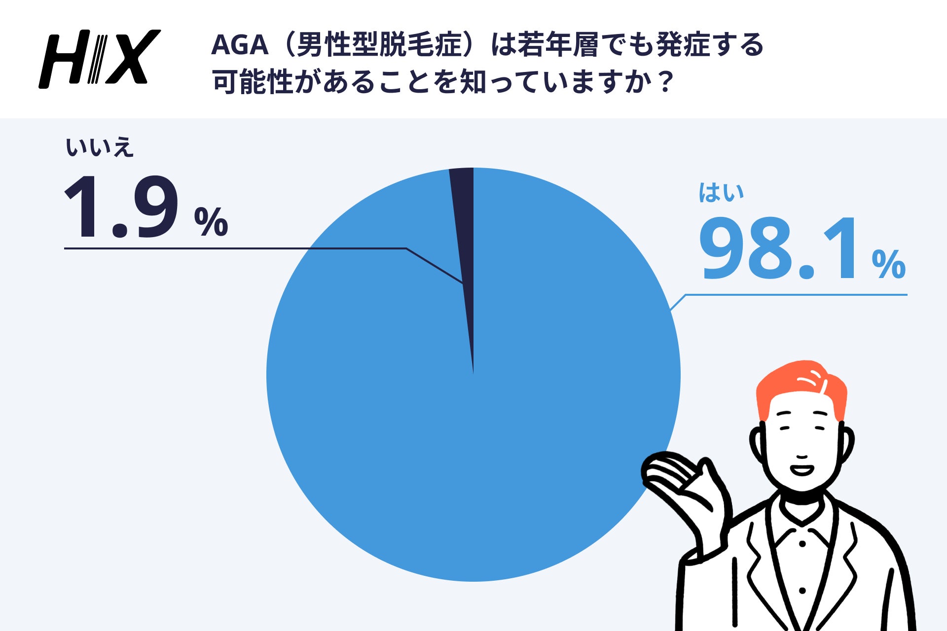 AGAは加齢によるものと考えられがちですが、実際には若年層でも発症する可能性があります。この認識について尋ねたところ、98.1%の人が「若年層でも発症する可能性があると知っている」といった認識していることがわかりました。