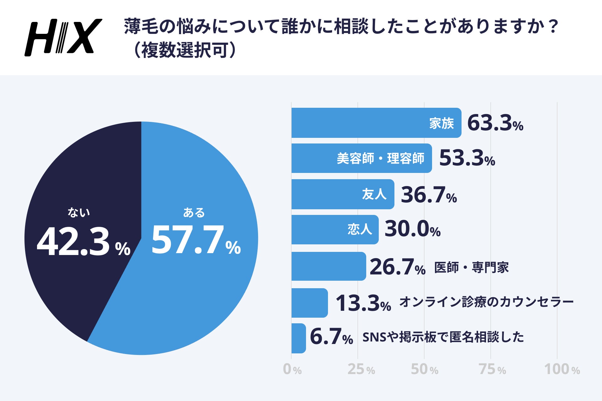 薄毛の悩みについて、誰かに相談したことがあるかを聞いたところ、「ある」と回答した人は57.7%、「ない」と回答した人は42.3%となりました。約4割の人が、薄毛の悩みを誰にも相談できていないという現状が明らかになりました。