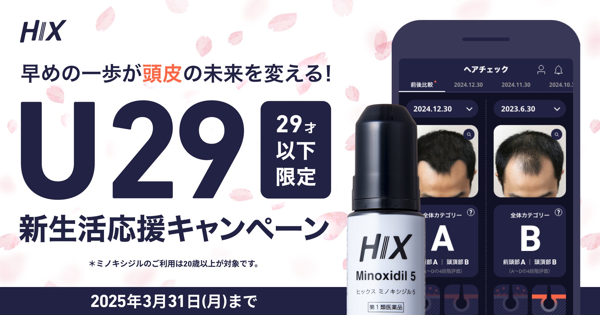 AGAセルフケアブランド『HIX(ヒックス)』(運営:株式会社エムボックス、本社:東京都豊島区、代表:金澤大介、以下:エムボックス)は、10・20代の若年層の薄毛に関する意識を明らかにするための調査を実施するとともに、U29(29歳以下)新生活キャンペーンを開催します。本キャンペーンを通じて、若年層の方々が正しい知識を持ち、早期治療を始めるきっかけとなることを目指します。