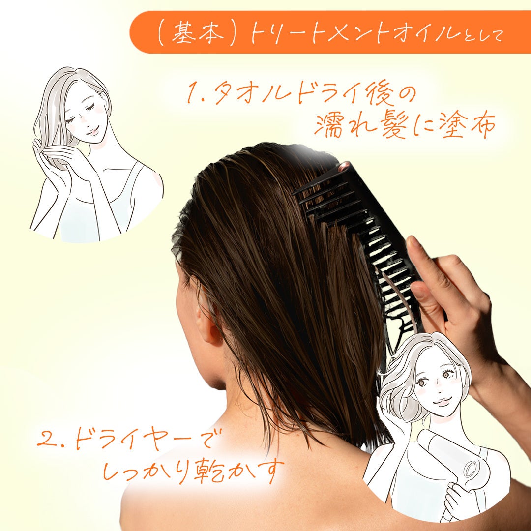 適量を手のひらでよく伸ばしたら、タオルドライ後の濡れた髪に塗布します。毛先を中心に髪全体にやさしくなじませ、ドライヤーで乾かします。