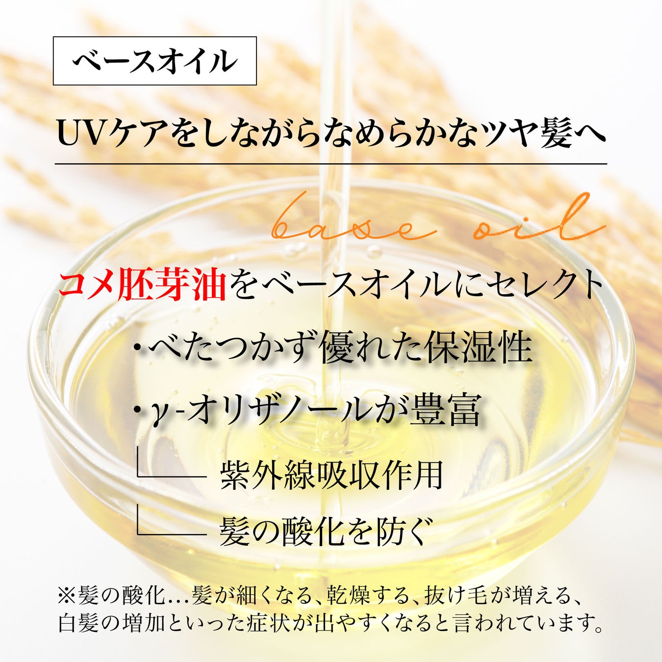 イッシは植物由来の紫外線防止成分で安心安全を求め、紫外線防止効果が高い「γ-オリザノール」を豊富に含むコメ胚芽油に注目。新商品では、メインのベースオイルをコメ胚芽油にし、計16種の植物オイルでブレンドしながら、前年に発売した「ザ ヘアキープオイル βショット」の浸透重視のコンセプト(後述)を引き継いでいます。