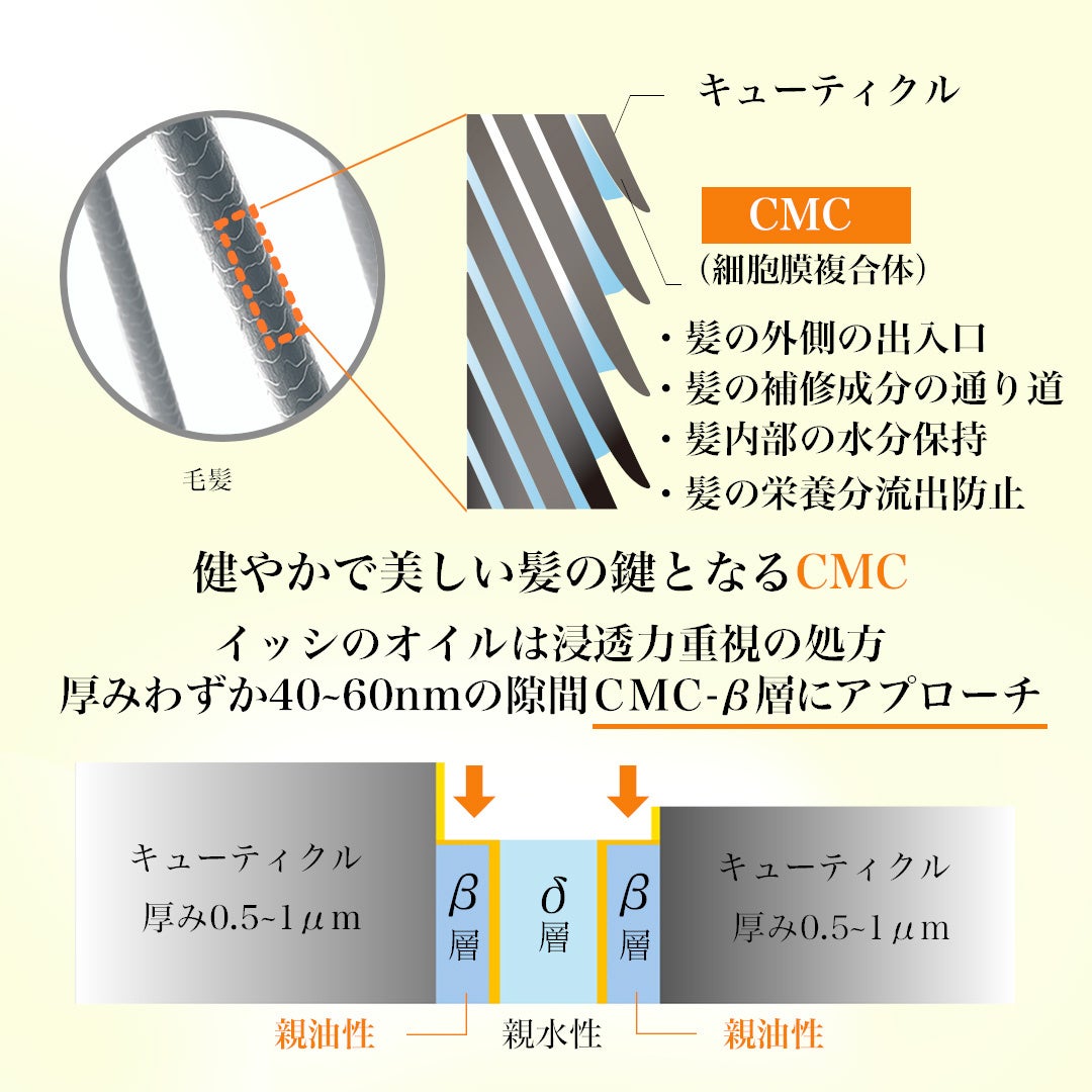 毛髪の内側と外側をつなぐキューティクルの40~60nm(ナノメートル)のわずかな隙間“CMC-β層”へのアプローチをコンセプトに、毛髪への浸透力を重視した処方組みで、髪の「うるおい、ダメージの補修、ダメージからの保護、ヘアスタイルキープ(熱を活用)」を追求したトリートメントヘアオイルです。