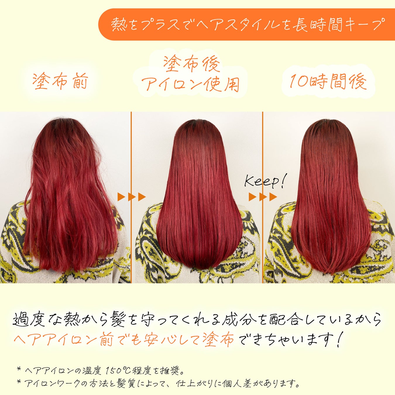 なお、過度な熱から髪を保護する成分もしっかりと配合されているため、安心してヘアアイロン等の熱器具を使用できます。