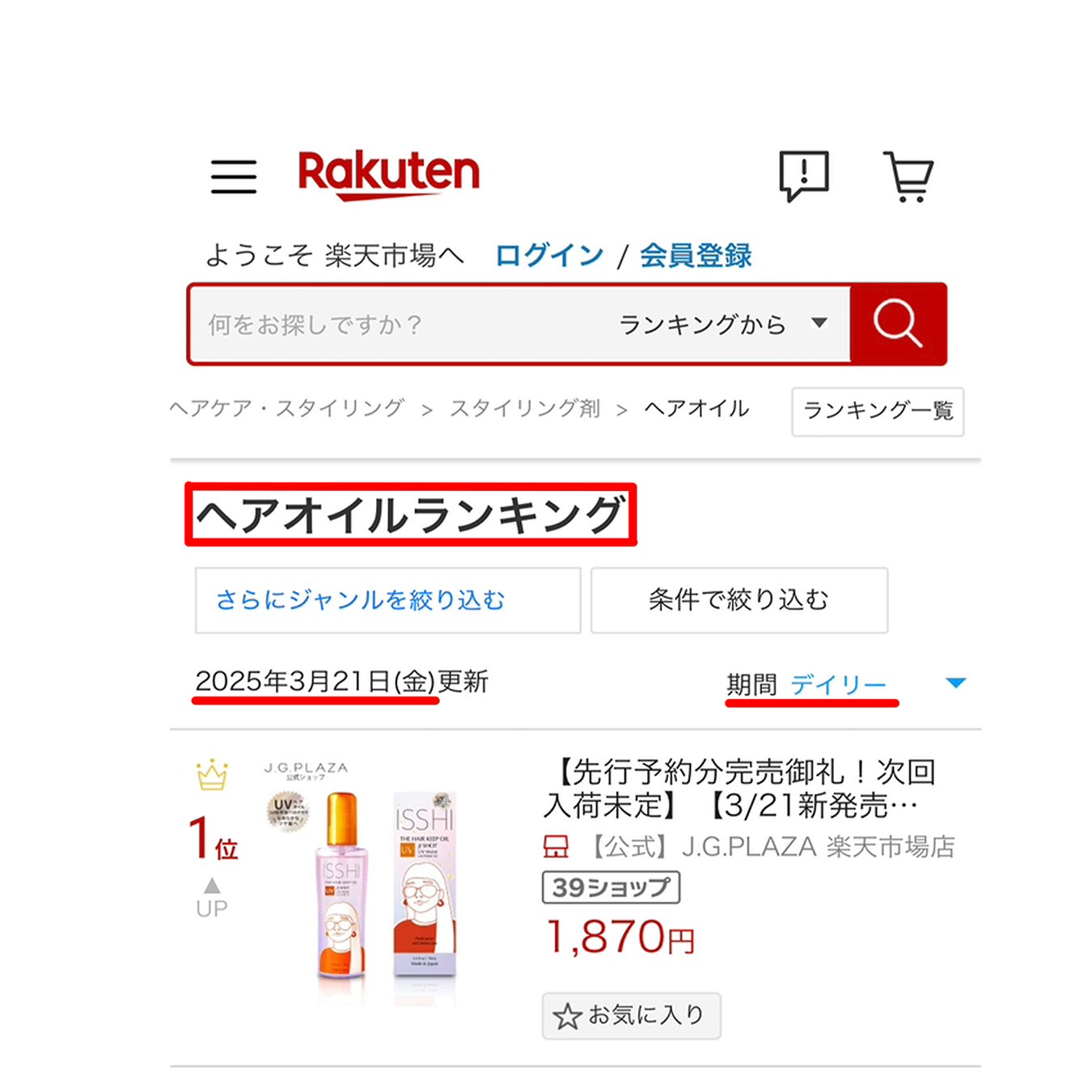 2025年3月21日(金)デビュー日に楽天デイリーランキング(ヘアオイル部門)で第1位を獲得。