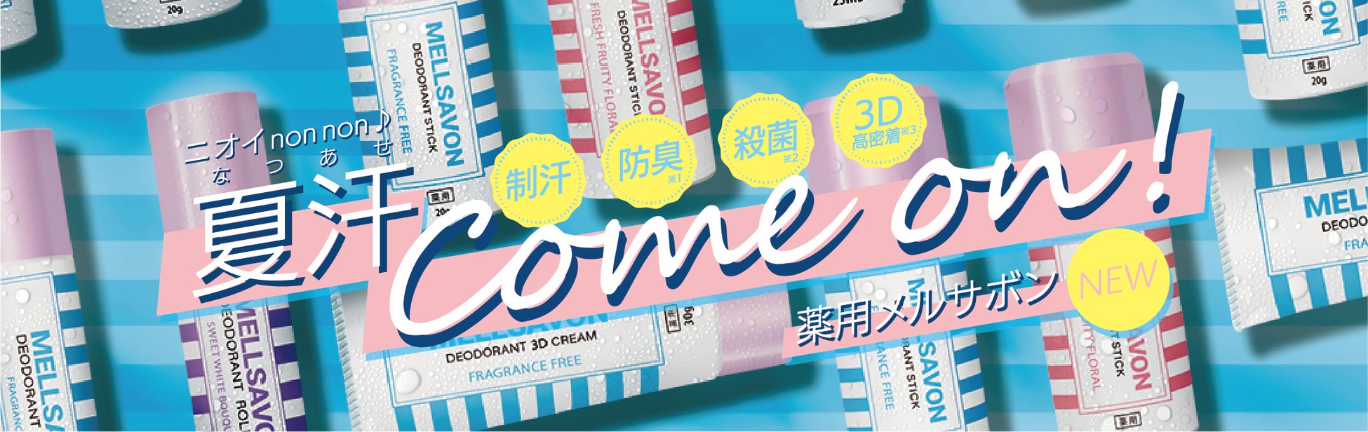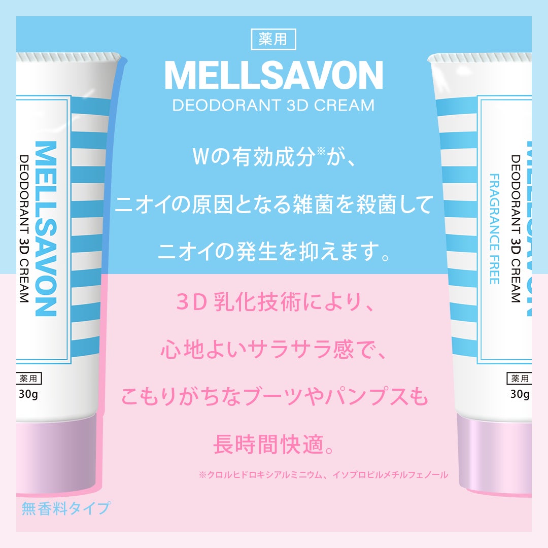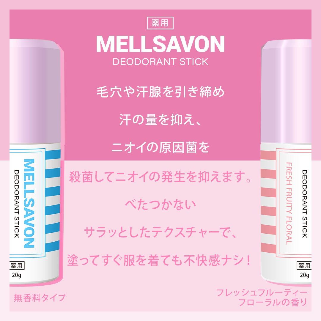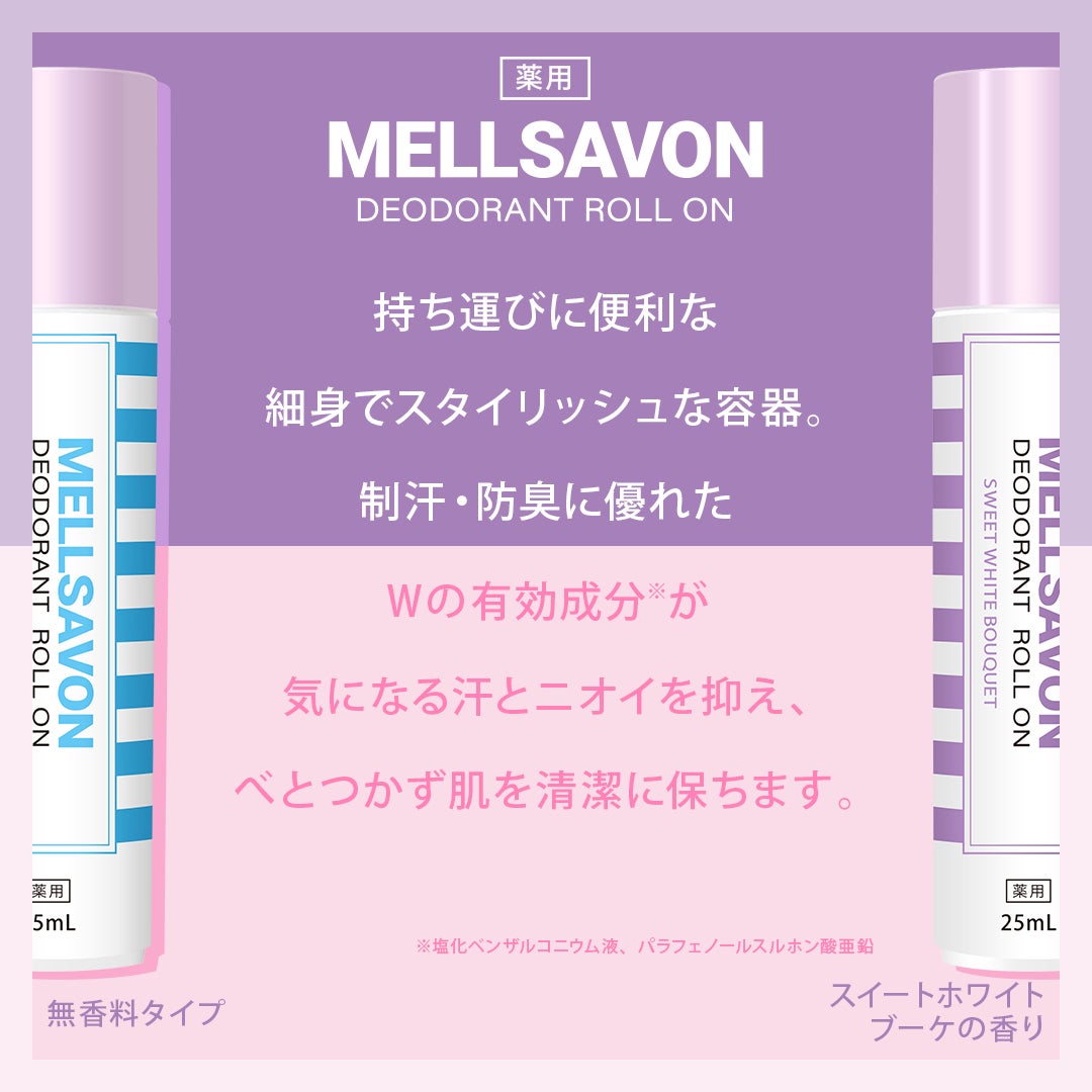 ブランド誕生以来、“かわいい” “美しい”デザインや、豊かな香りにこだわってきたメルサボンから、全世代が抱える汗・ニオイのお悩みに応えたデオドラント商品が本日3月21日発売開始。薬用なのにかわいいデザインで、嫌な汗の季節もニオイの心配なくポジティブな気持ちになってほしいという思いを込めました。