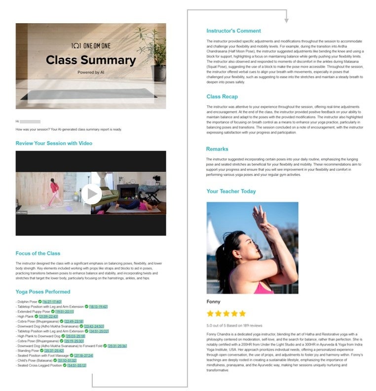 これにより、ユーザーはレッスン中に自身が練習したヨガポーズと講師からのアドバイスを振り返る動画つきレポートを、すべてのクラスで受け取れるようになりました。