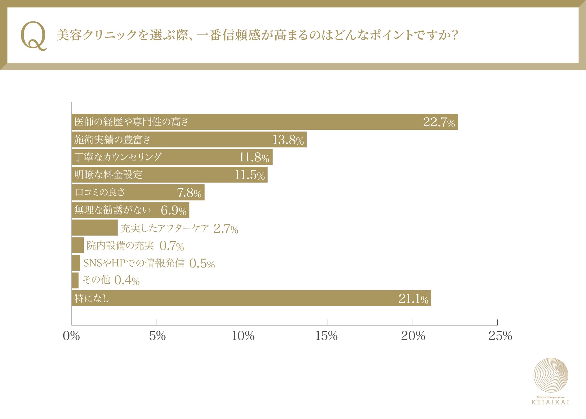 トップ3:①医師の経歴や専門性の高さ 22.7% ②施術実績の豊富さ 13.8% ③丁寧なカウンセリング 11.8%