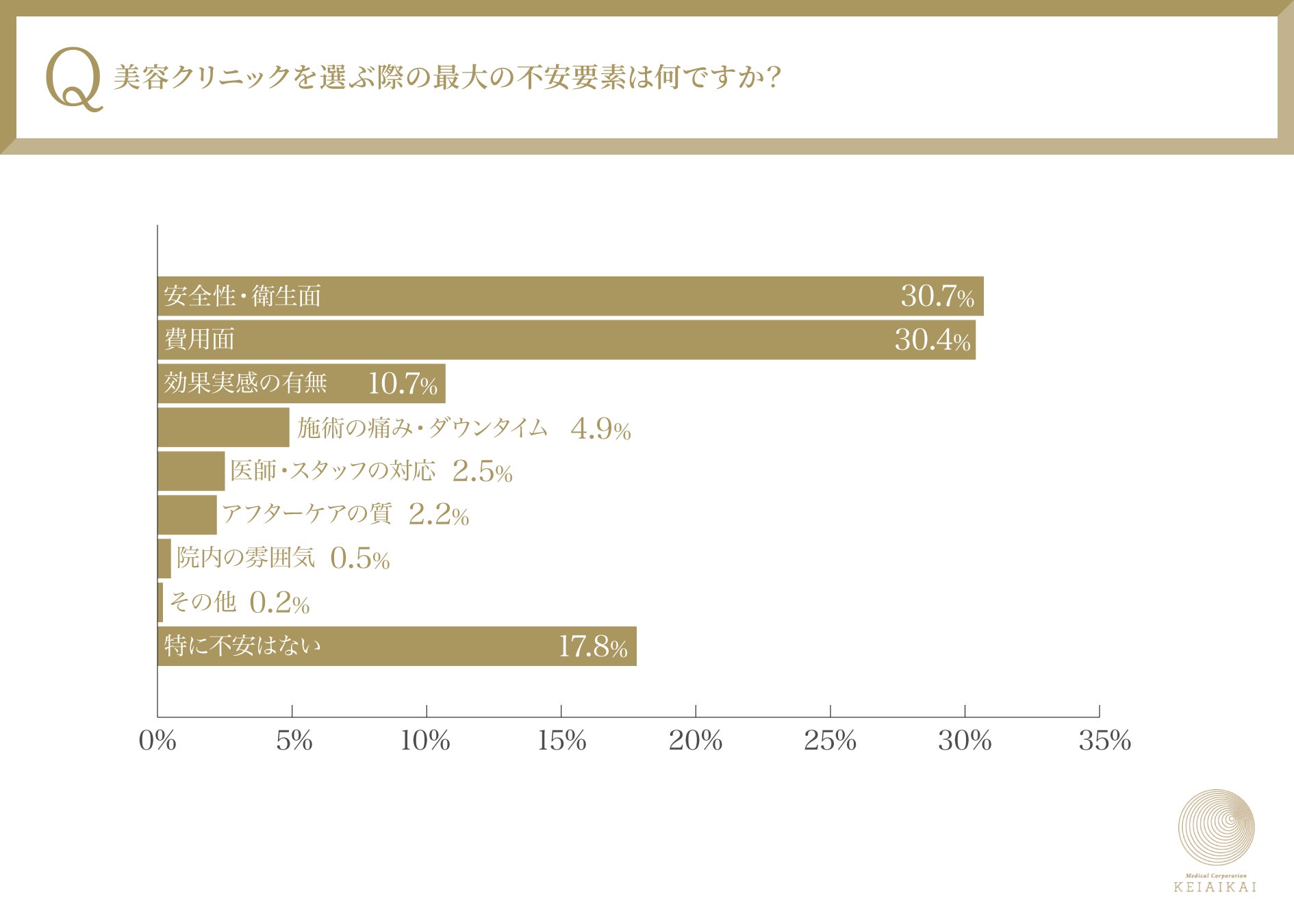 クリニック選びの不安の大部分は「安全性・衛生面」(30.7%)と「費用面」(30.4%)