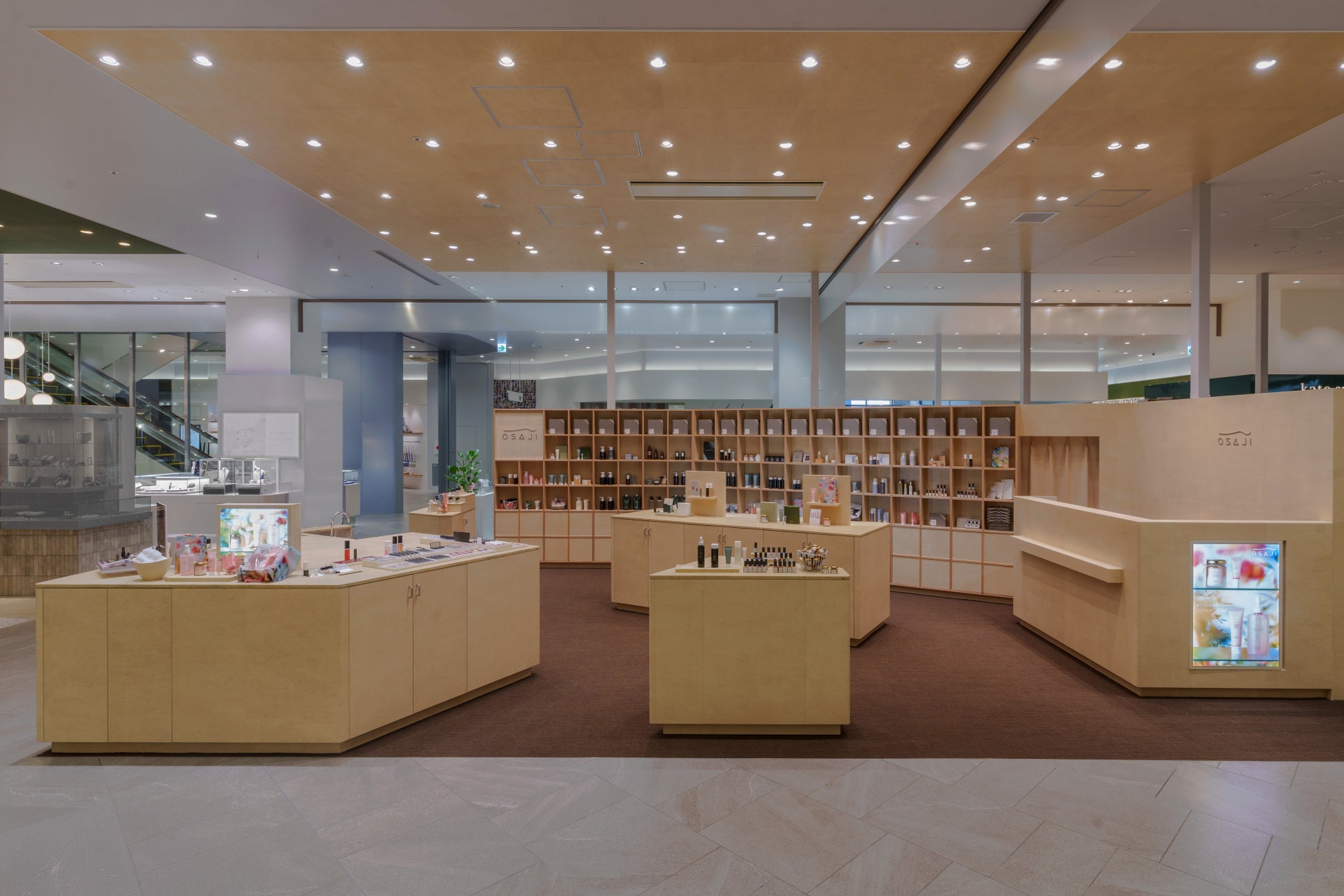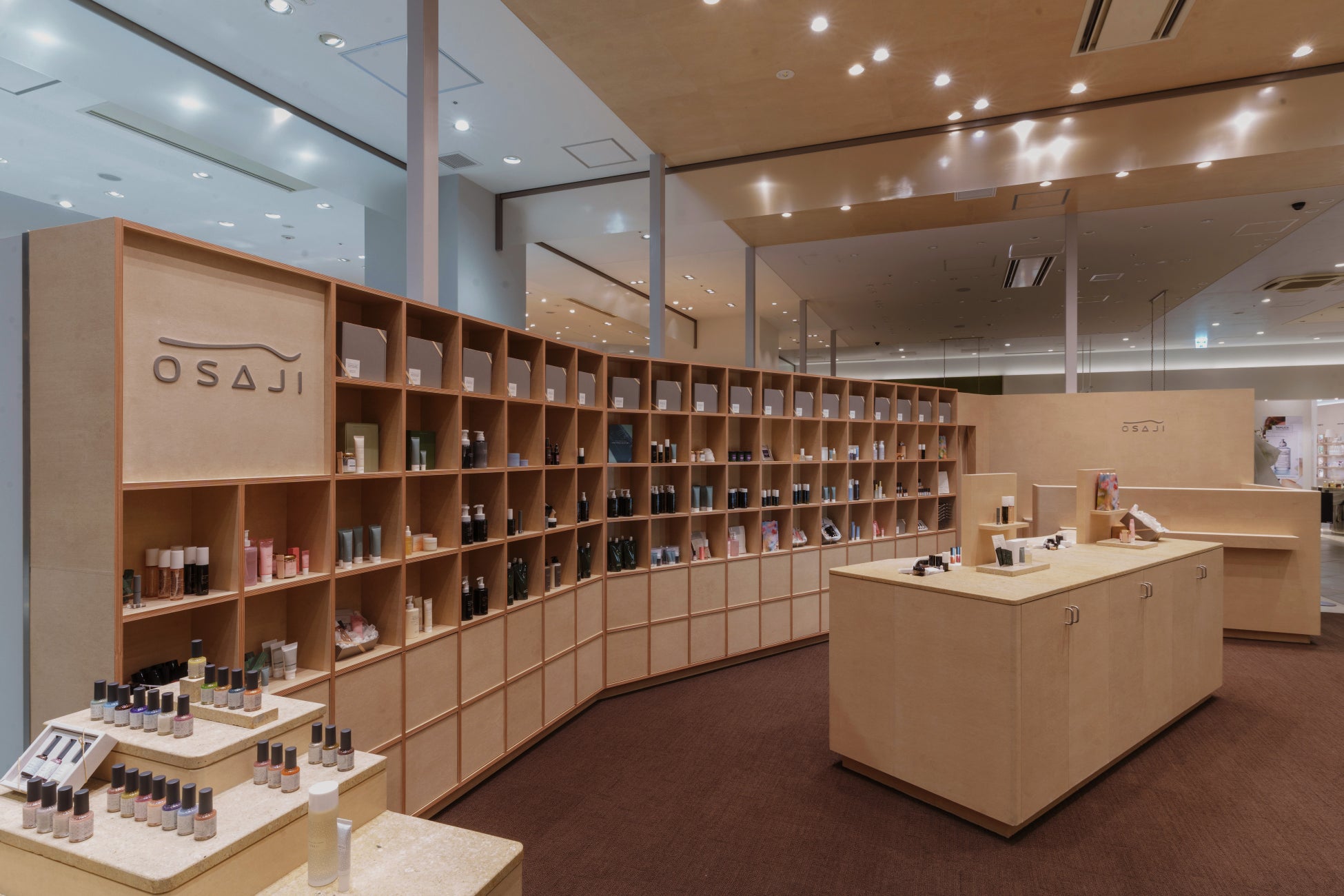「OSAJI 広島ミナモア店」は、店舗を訪れた方々が純粋に肌のことを考え、相談し、試せる空間を設計しました。店舗中央に、来客を受け止める大きなカウンターを用意し、その背景には、自分に合った商品が見つけられるよう、商品が一覧できる壁面棚を配置。その壁面棚は共用部の人の流れを自然と受け止められるように緩やかな角度を持たせた構成となっており、それにより共用部とも連動感を感じる開放的な場所となっております。