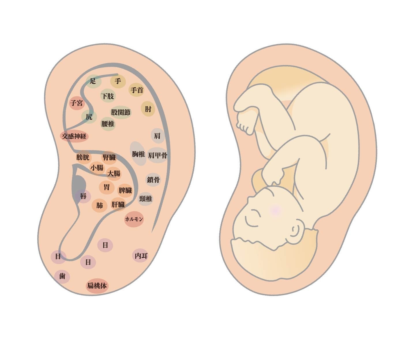耳はよく見ると胎児の形をしており、この胎児図のツボ位置が、結びついている全身各所に働きかけると言われています。