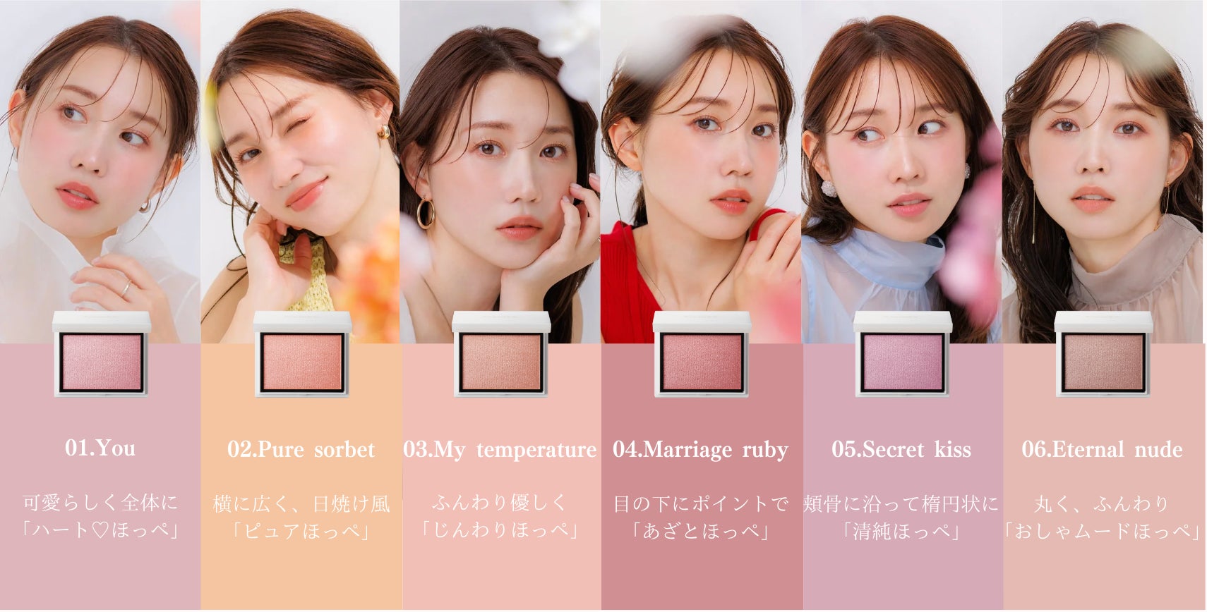 ”チーク=血色感”を超えた遊び心のある全6色がメイクの楽しさを広げ、「纏うほど自分に見惚れる瞬間」を演出。心から表情まで、内外面の”多幸感”を引き出し、誰もがメロメロになるチークとなっています。