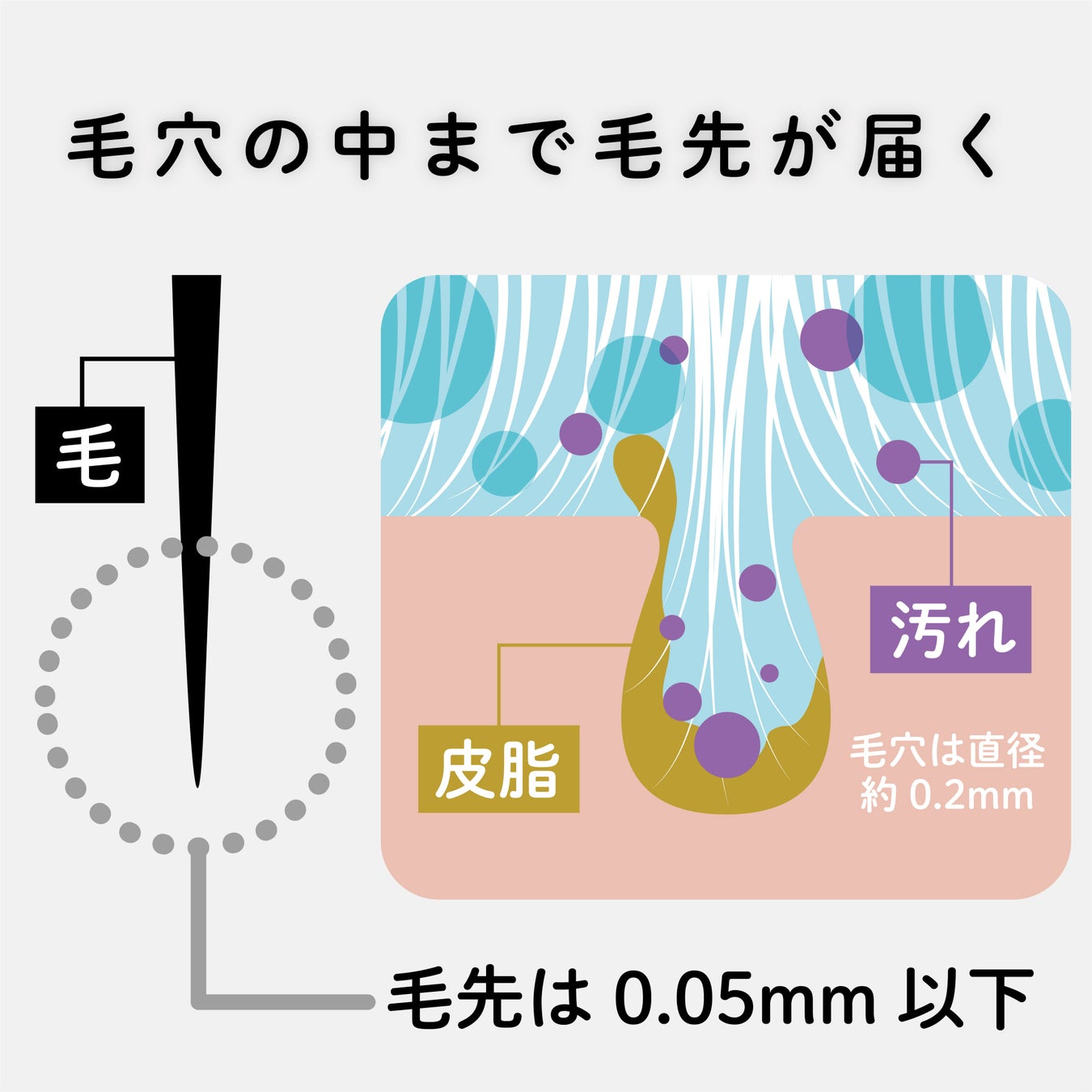 約50~60ミクロンの超極細毛が約70万本密集しており、毛の一本一本が毛穴の奥までしっかりと届きます。特に毛穴が詰まりやすい小鼻の際にも使いやすい、しずく型の形状を採用。毛穴よりも直径の小さい超極細ブラシにより、軽く撫でるだけで汚れを取り除きます。