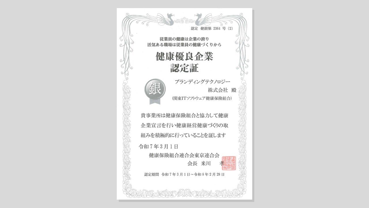 ブランディングテクノロジー株式会社(代表取締役社長:木村 裕紀、本社:東京都渋谷区、証券コード7067、以下当社)は、健康保険組合連合会東京連合会に健康経営に向けた取り組みが評価され、健康優良企業「銀の認定」を取得いたしました。当社は認定評価で100点を獲得し、取得企業全体の上位1.7%に位置しています。健康優良企業認定番号 健銀第2364号(2)