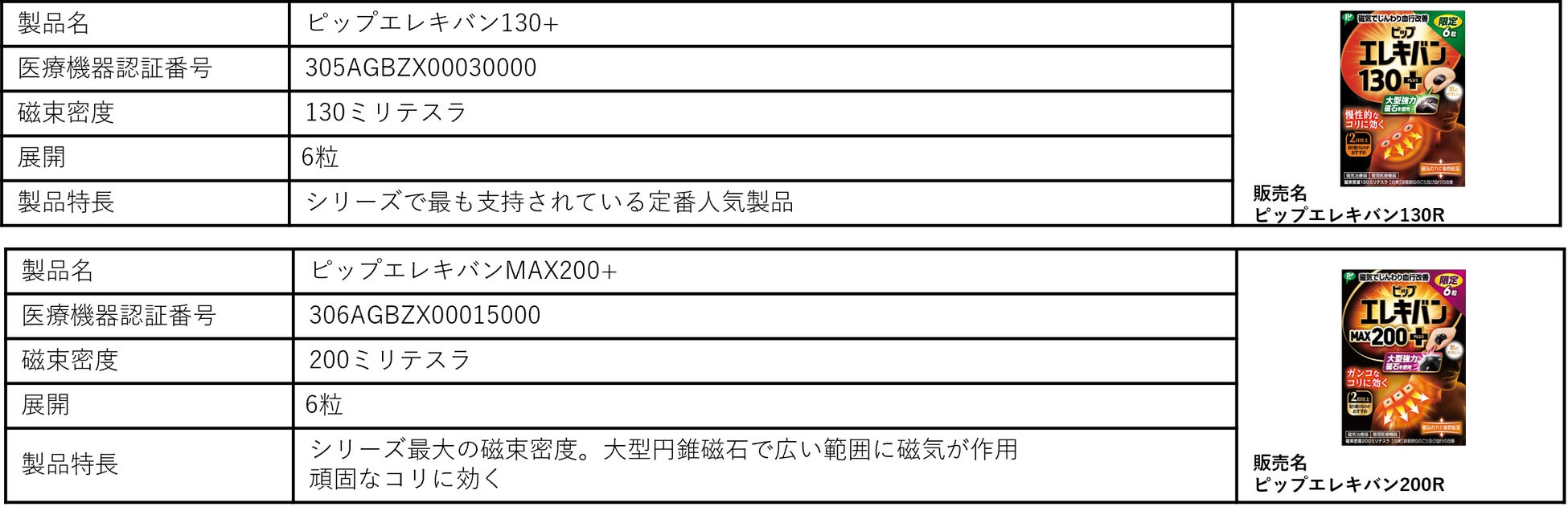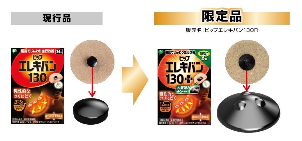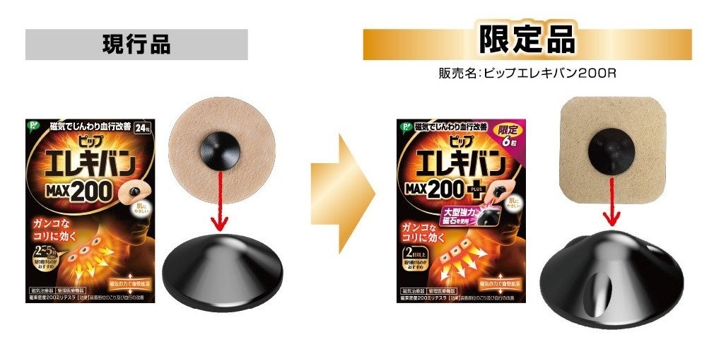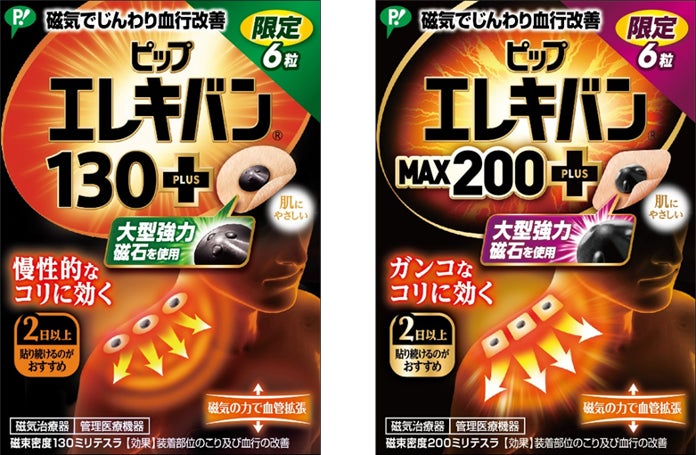 ピップ株式会社(本社:大阪市中央区、代表取締役社長:松浦由治)は、磁気の力で血行を改善しコリをほぐす磁気治療器「ピップエレキバン」から数量限定で「ピップエレキバン130+」と「ピップエレキバンMAX200+」を4月9日(水)に発売します。磁石の形状変更を行い、突起もついたことで従来品に比べて磁力が「ピップエレキバン130+」は広く、「ピップエレキバンMAX200+」は深く届くことが特徴です。