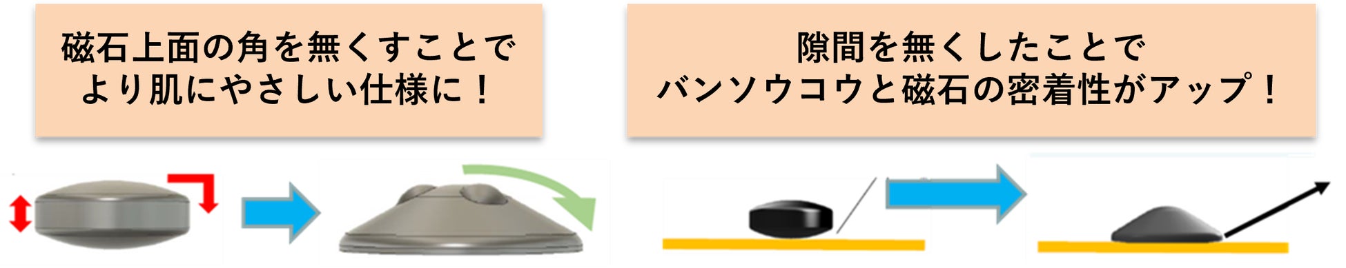磁石のサイズアップと3つの突起により、磁力がより広くしっかり届く!肌に当たる面積も現行品に比べて約2倍に拡大<図1>。
