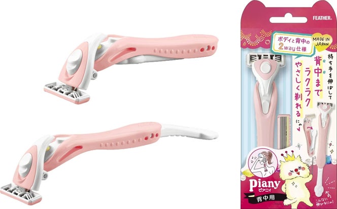 「ピアニィ」シリーズより、ボディと背中のムダ毛処理がこれ1本で完結する2WAY仕様のカミソリです。背中の毛は自分では見えにくく、処理が難しい部分ですが、「ピアニィ背中用」は、持ち手を伸ばせる設計になっており、簡単に背中全体をケアすることができます。さらに、フェザー独自の刃技術により、肌に優しく、なめらかに剃れる仕様になっています。