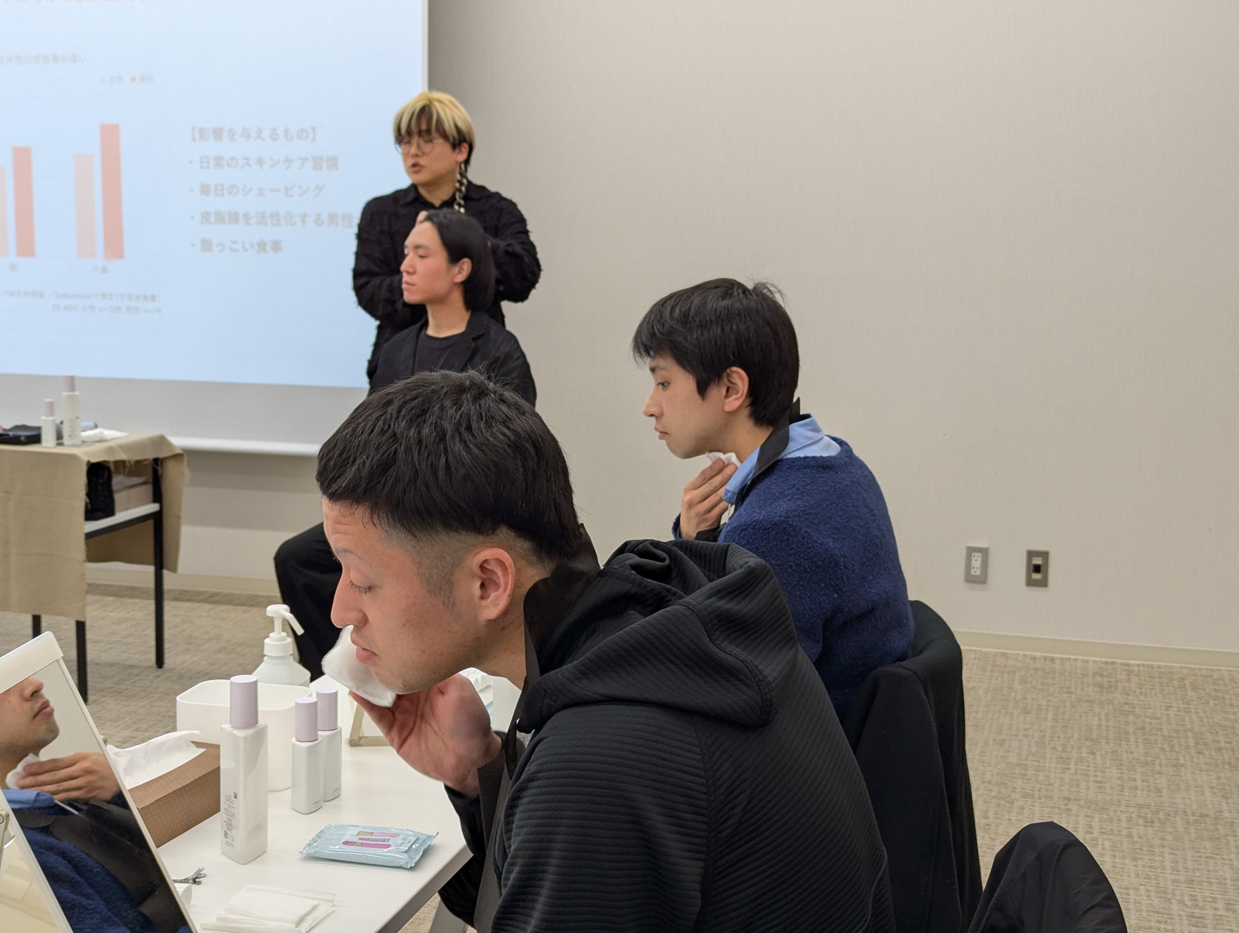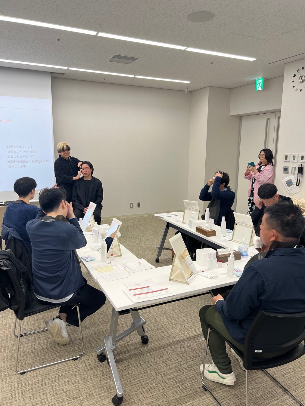 ベースメイクのセッションでは、HowTo動画を視聴しながら、講師が半顔を仕上げるデモンストレーションを実施。もう半顔は参加者自ら仕上げる形式で行い、翌日から自分ひとりでも再現できる実践的なスキルを身につけました。参加者は自身の肌の見た目が変わっていくことを楽しみながら、美容のスキルを習得していました。