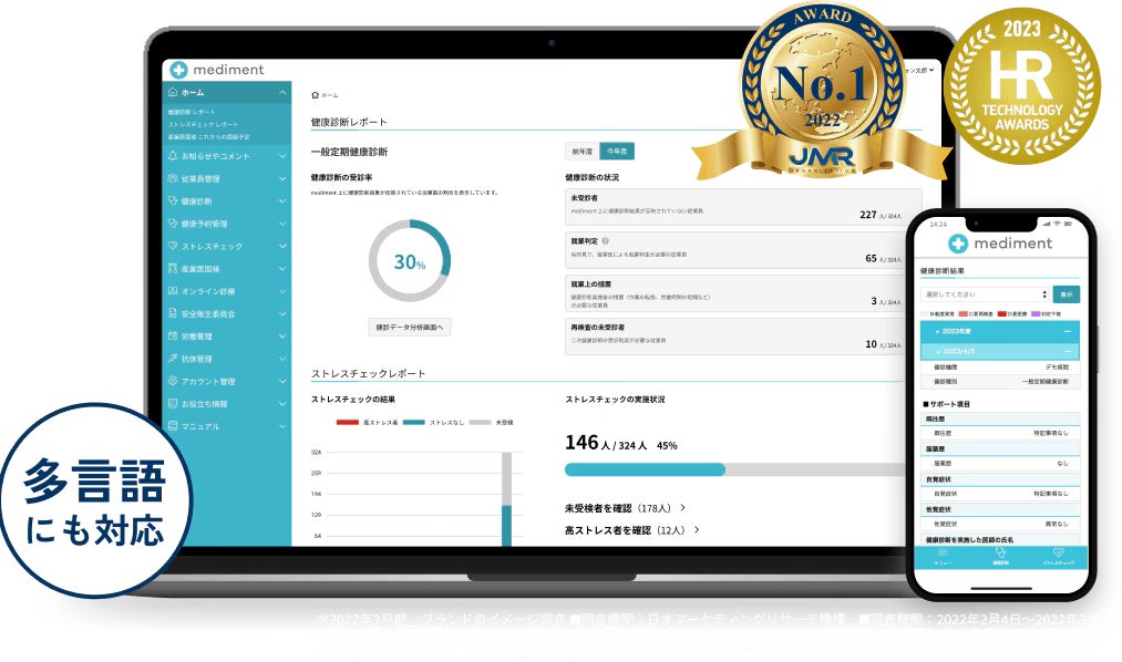「mediment(メディメント)」は、健康経営や従業員の健康診断・ストレスチェック業務を担う人事労務担当者向けサービスです。