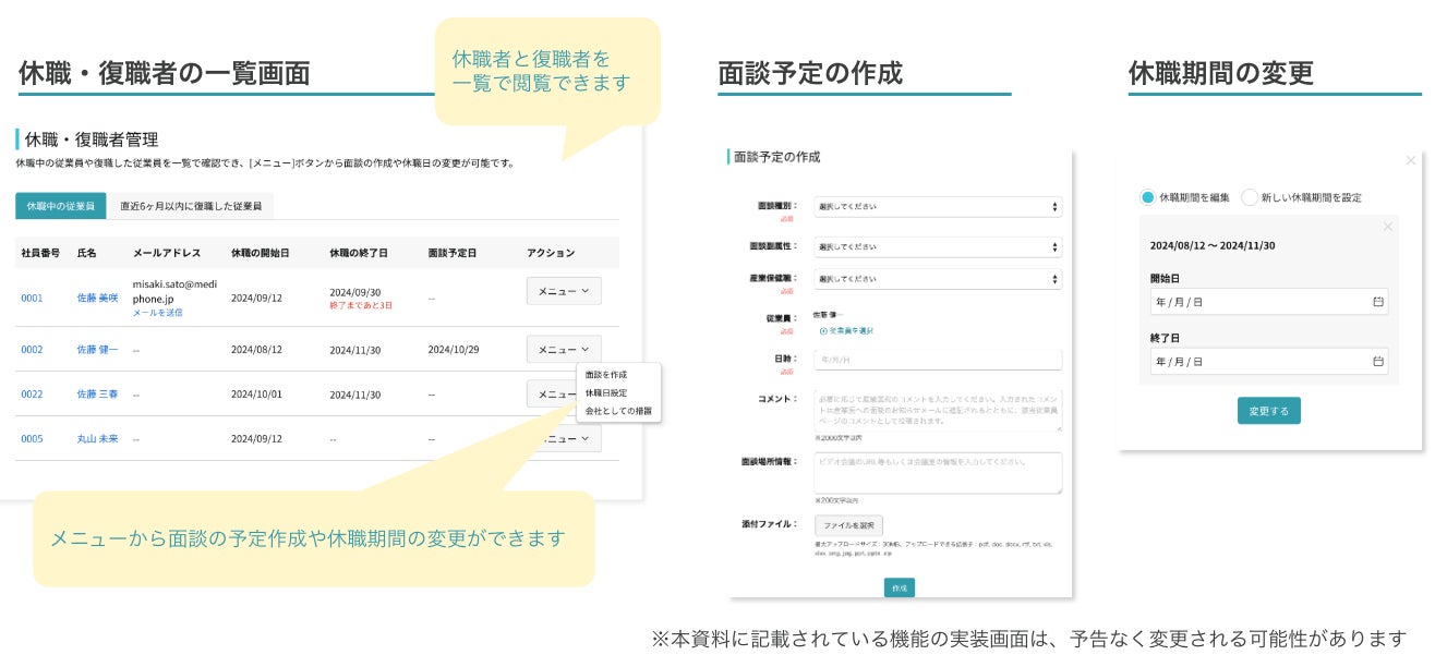 本機能により休職中および復職した従業員が一覧でわかり、面談対応や休職日変更などの人事担当者の管理にかかるコストを大きく下げることができます。操作画面はシンプルなデザインで、対応が必要な従業員が一目で判別可能です。また、産業医面談の管理や記録もmedimentで残せるため、周辺業務も一元管理することが可能です。
