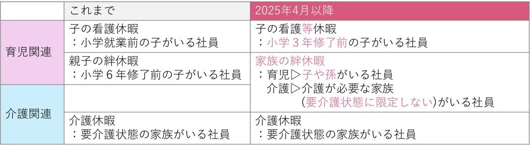 2025年4月から、育児・介護休業法が改正されます。「子の看護休暇」は「子の看護等休暇」に名称変更し、対象が小学校3年生修了までに引き上げられ、感染症に伴う学級閉鎖や、入園・入学式、卒園式でも取得できるようになります。