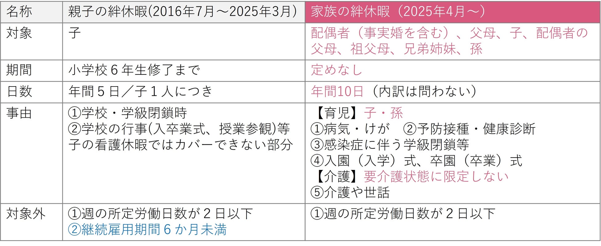 特に介護の面においては、介護休暇とは違い、対象家族を要介護状態に限定していません。要介護状態になる前から家族の支援を行うことで、介護レベルが上がることを防いだり、遅らせたりする一助になればと考えております。