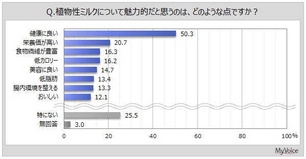 植物性ミルクについて魅力的だと思う点は(複数回答)、「健康に良い」が50.3%、「栄養価が高い」が20.7%、「食物繊維が豊富」「低カロリー」が各2割弱です。