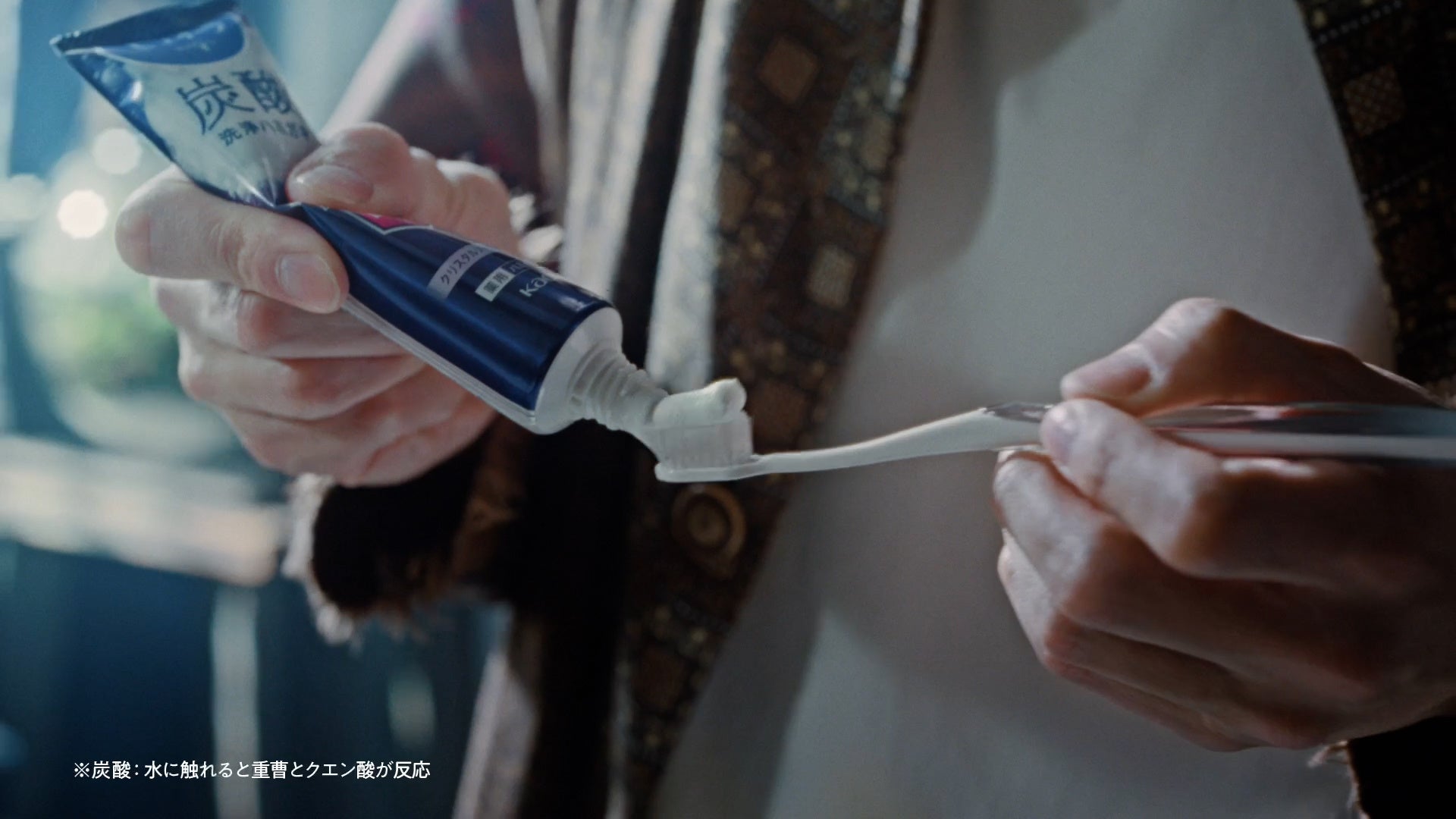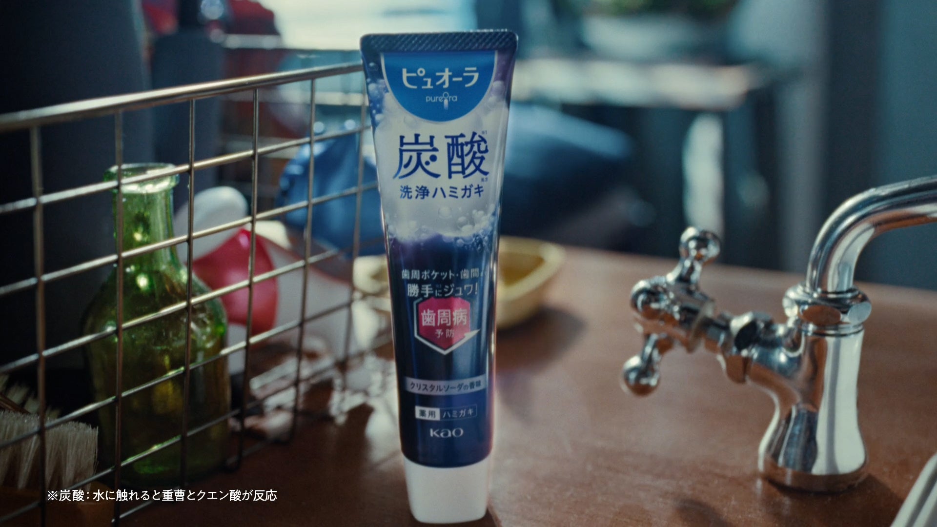 見どころはやはりあのジュワっと炭酸*2泡が広がる時の表情といいますか、ハブラシ入れたまま、口は開かないで、驚きの顔はありつつ、喜びの顔もする点ですね。ただ(口にハブラシが)入っているため口角が上げづらく少し難しかったですが、それでちゃんとこのピュオーラ炭酸ハミガキの良さが伝われば良いなと思いましてので、かなり集中しました。