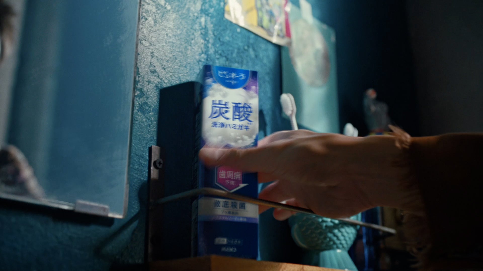本TVCMでは山田さんが、出かけるために急ぎ身支度を始めるシーンから始まります。鏡を見ながら髪を整える山田さんはふと何かに気づき横を見ると、そこにはピュオーラ炭酸ハミガキが置いてあります。