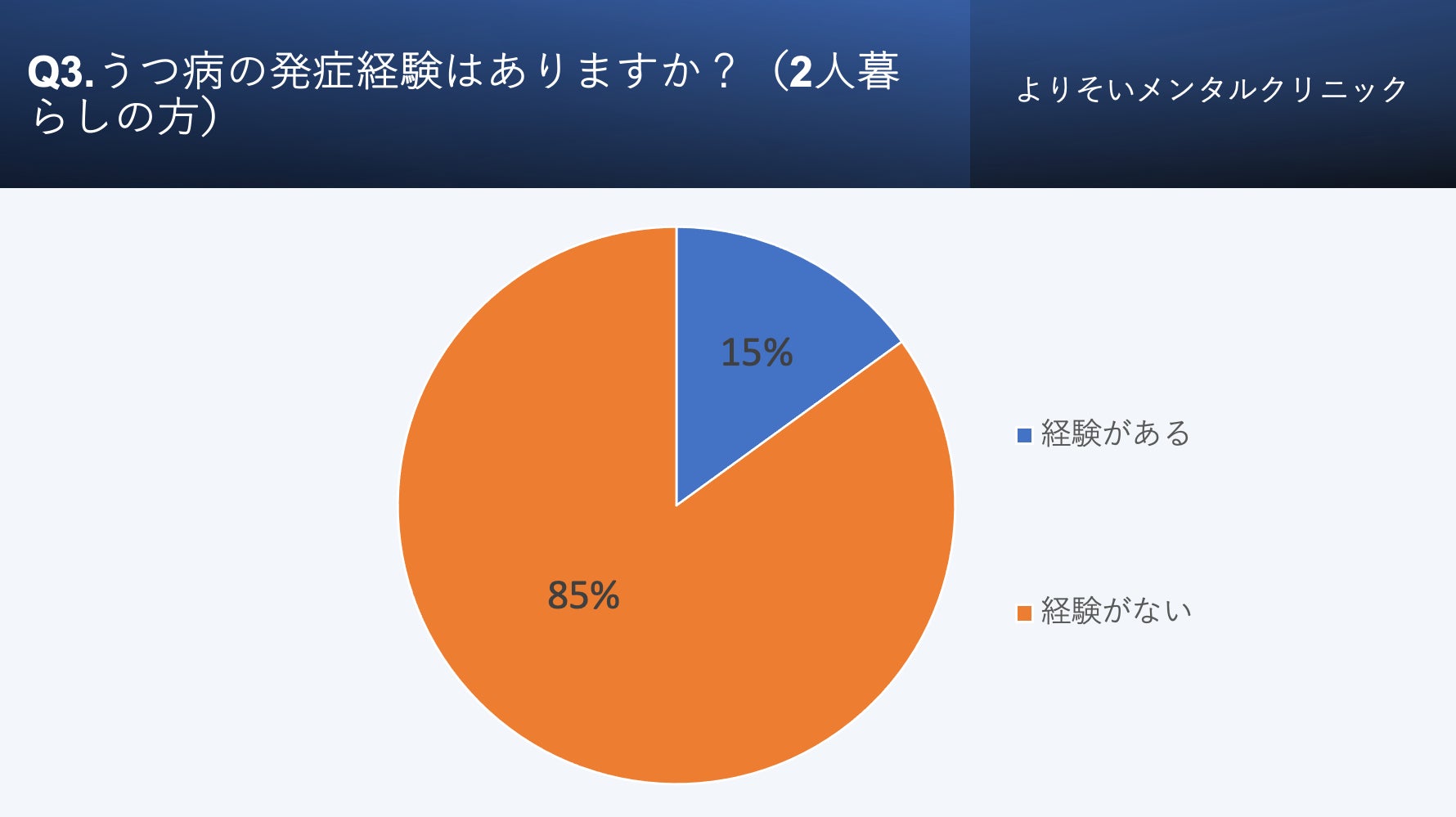 その結果、うつ病の発症経験者は15%と2人以上で暮らしている世帯の約2倍であることが分かりました。