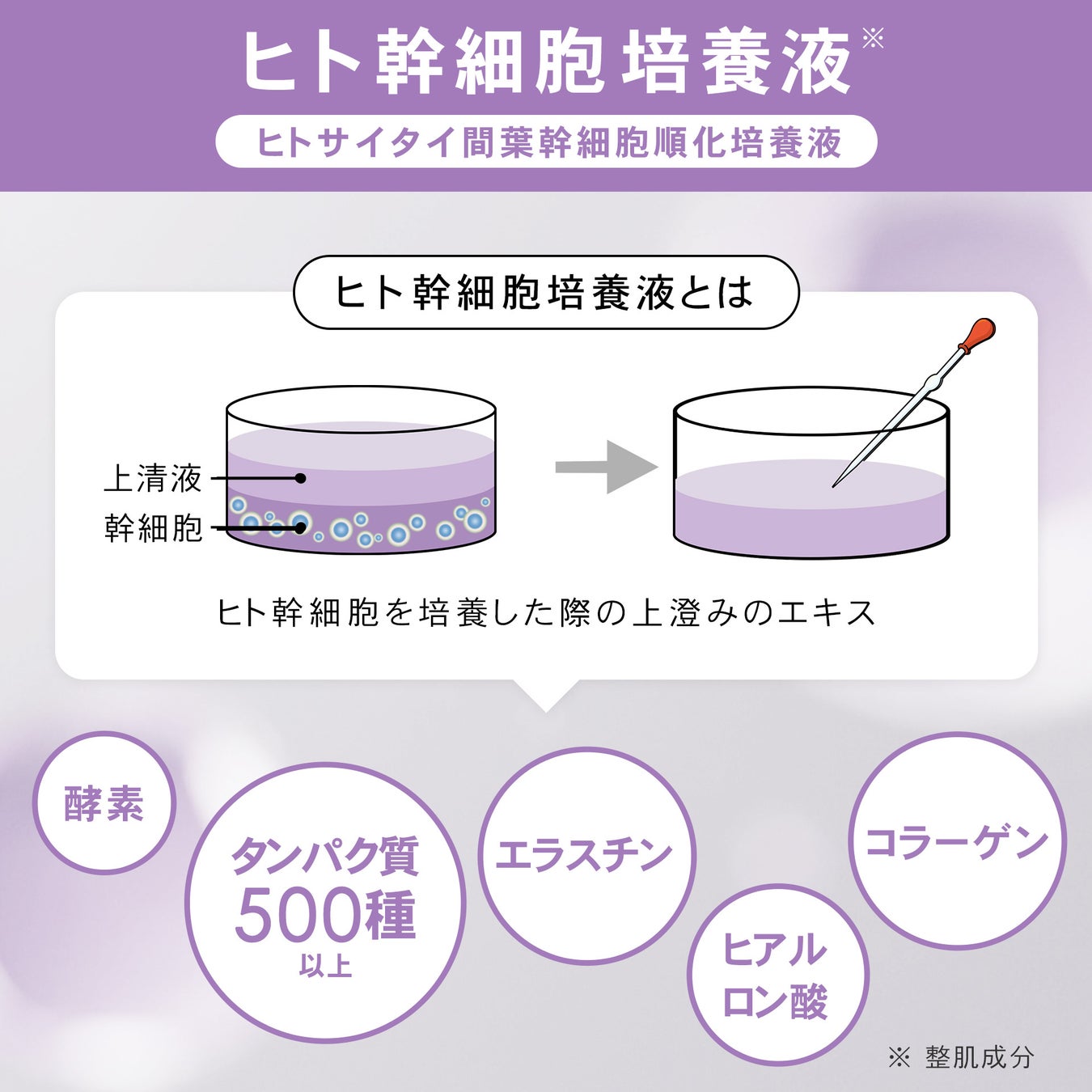 ヒト幹細胞培養液*4はヒト幹細胞を培養した際の上澄みのエキスで、500種類以上のたんぱく質のほか酵素、コラーゲン、ヒアルロン酸、エラスチンなどを豊富に含む成分です。