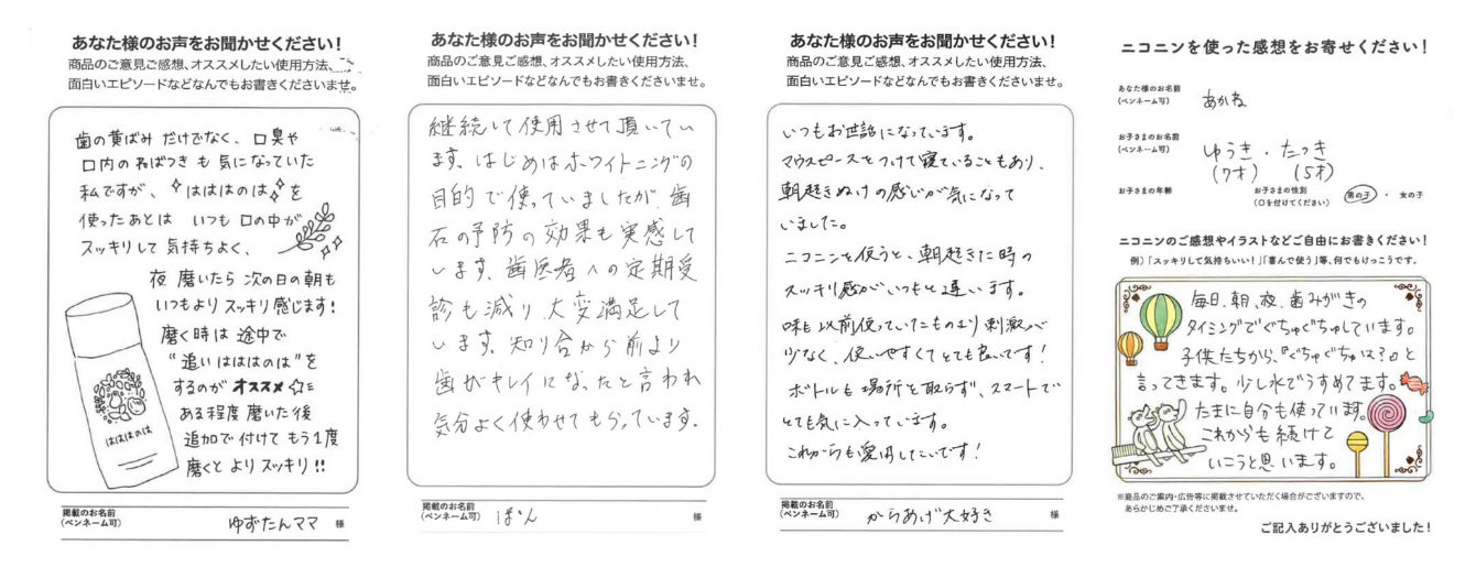 お客様から実際に嬉しいお声をいただいており、「歯が白くなった!」や「口臭が気にならなくなった」など効果を実感していただけています。
