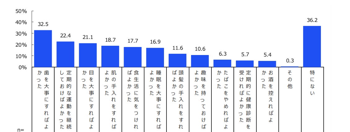 厚生労働省の調査によると健康に関して、「もっとこうしておけばよかったこと」という質問に対し、全体で運動や食生活などさまざまな項目がある中で「歯を大事にすればよかった」という回答が1000人のうち、32.5%も占めています。この数字は数ある項目の中で1番多いお悩みとなっています。