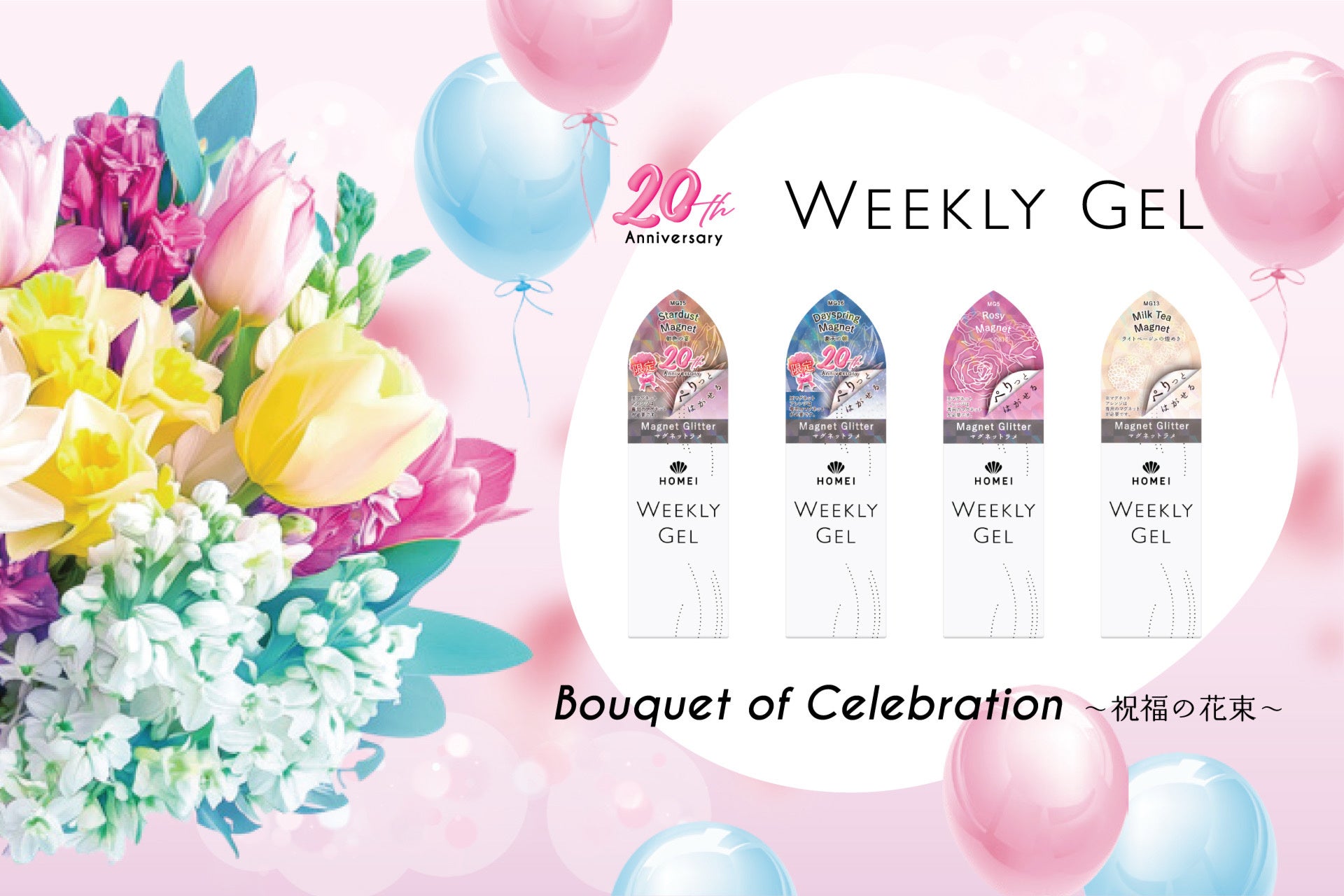 これを記念し、人気シリーズ ウィークリージェル から「Bouquet of Celebration~祝福の花束~」をテーマに、これまで支えてくれた皆様への感謝を込めて美しい瞬間を彩る新色限定2色を、4/24(木)午前10時より公式オンラインストア( https://homei-nail.jp/ )にて先行発売、5月上旬よりロフト、PLAZA、ハンズなどの全国のバラエティショップにて発売いたします。 ※店舗により展開時期が異なります。
