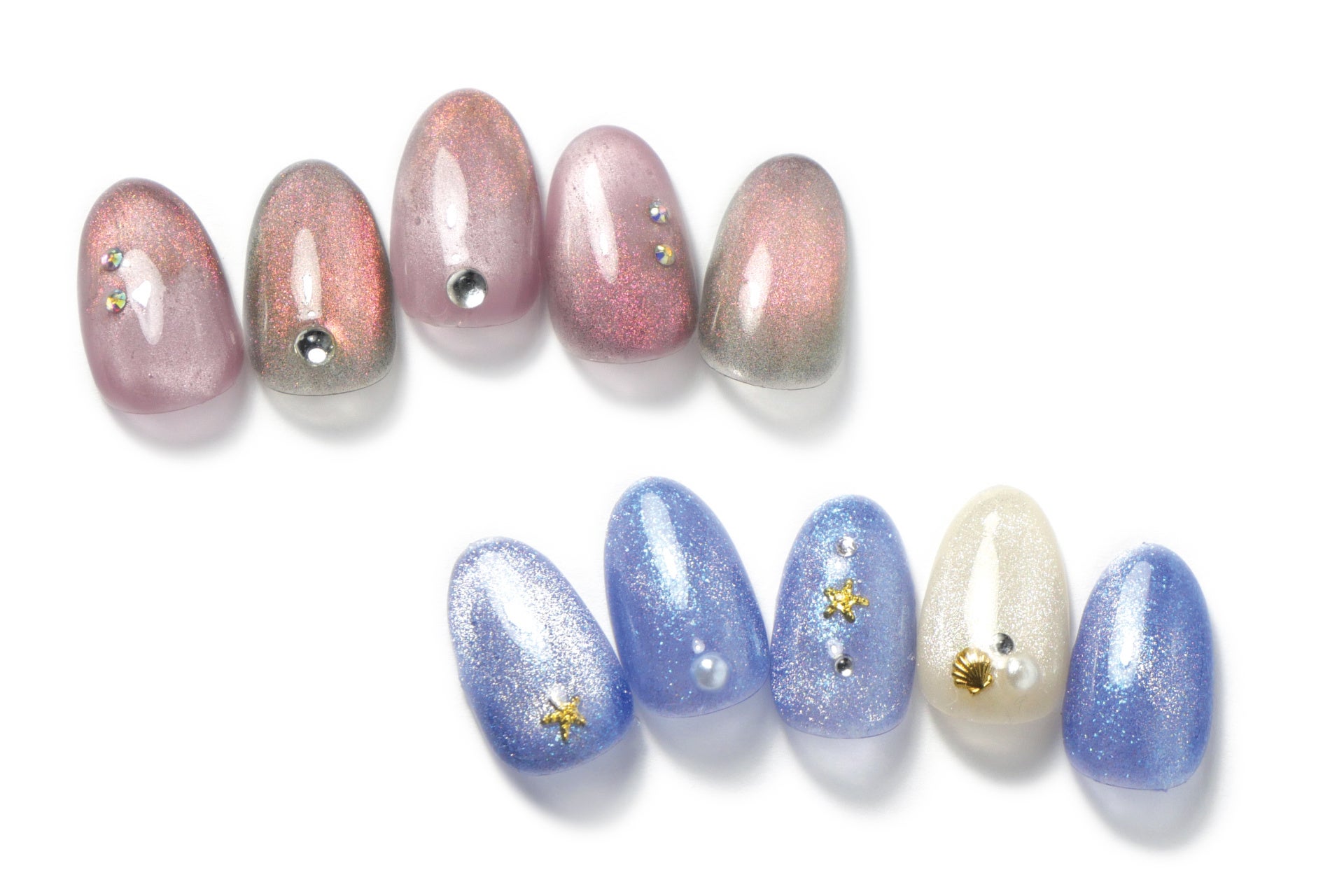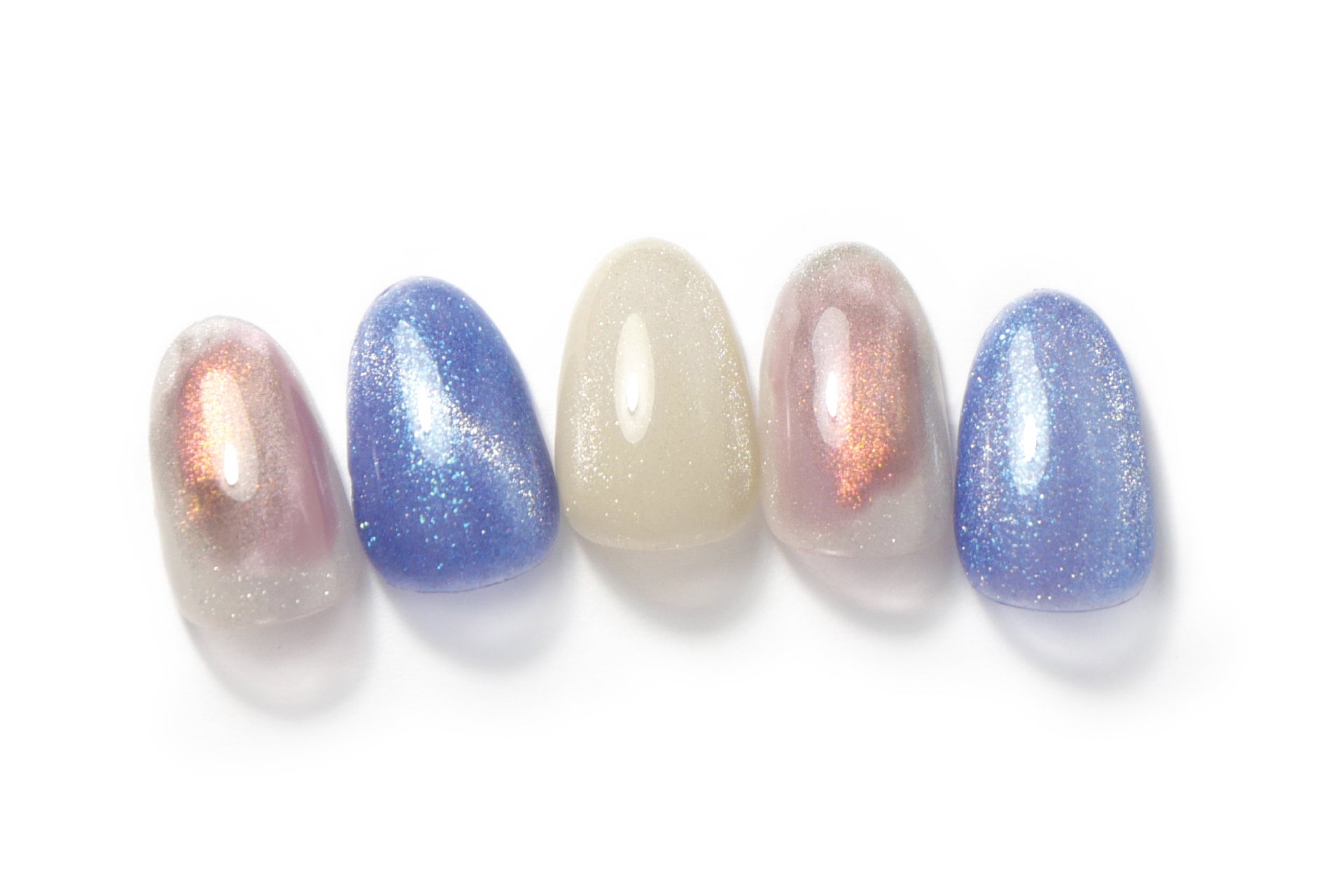 透明感のあるグレイッシュなベースに、ピンク・オレンジの偏光フラッシュマグネットグリッターが揺らめき、虹色の星空を映し出します。