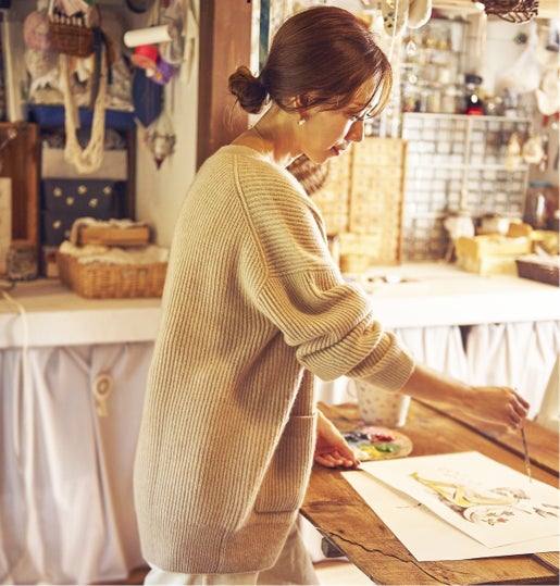 『まるで大きな花束をもらったときのようなぱっと目を惹く色鮮やかでときめくBOXをイメージして描きました。少し浮き出るようなお花の立体感を作りたく油彩のような、絵の具の厚みを感じられる質感で描いています。素敵なLAURA MERCIERさんのアイテムを贈る人も、もらう人も心躍る時間となる演出につながれば嬉しいです』