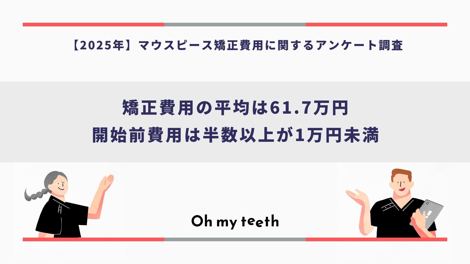 株式会社Oh my teeth(本社:東京都新宿区、代表取締役:西野誠)は、マウスピース矯正経験者を対象に「マウスピース矯正の費用に関する実態調査」を実施しました。