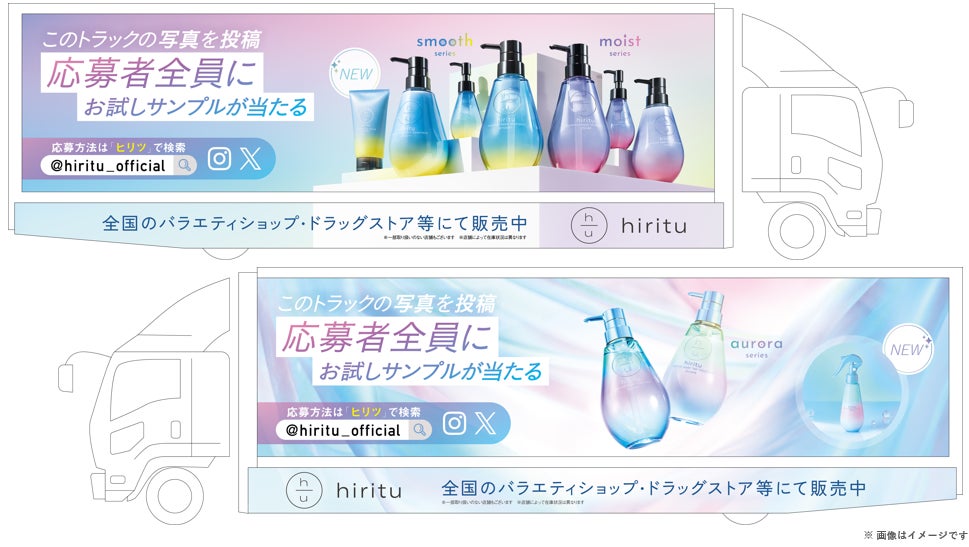 さらに、トラック広告と連動したSNSキャンペーンも開催。走行中のトラックを撮影し、SNSに投稿していただいた方全員に、「ヒリツ シャンプー&トリートメント 1DAYトライアル」をプレゼントいたします※2。期間限定の特別なキャンペーンとなりますので、ぜひこの機会にhirituの商品をお試しください。