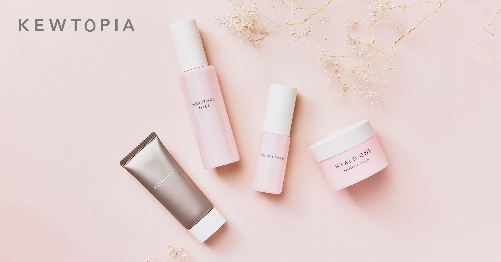 キユーピーウエルネスは、「ピュアヒアロ」「モイスチャーミスト」をはじめ、オールインワン美容ジェル「ヒアロワン」手・首周り用のエイジングケアクリーム「ハンデコルテ」など、ヒアルロン酸配合のスキンケアシリーズ「KEWTOPIA(キユートピア)」を展開しております。