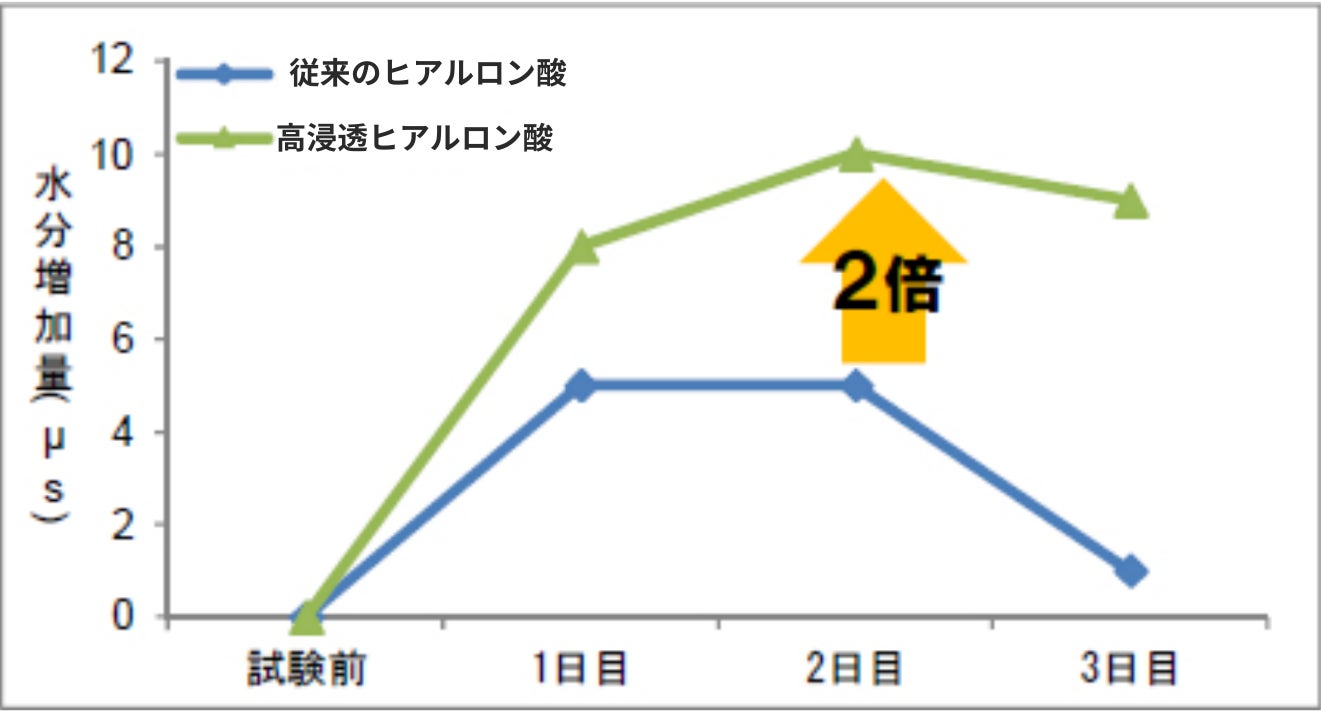 低分子型ヒアルロン酸「高浸透ヒアルロン酸」は肌の角質層まで浸透し、通常のヒアルロン酸と比較して塗布2日目の肌の水分量を約2倍増加させます(※3)。