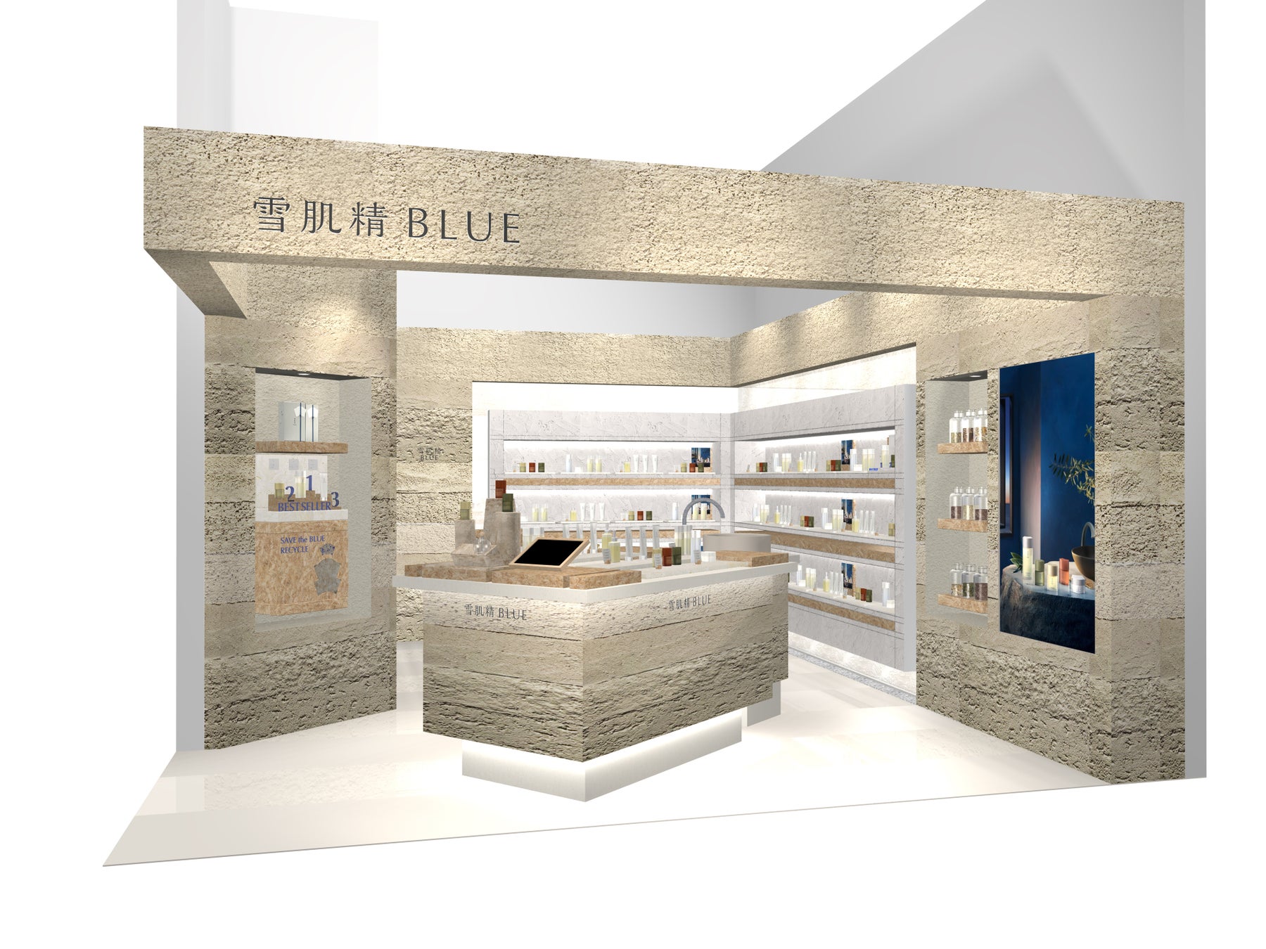 この度、「雪肌精 BLUE」と「Prédia BLUE」のコンセプトの異なるふたつのシリーズを同じ空間で体感できる、シリーズを象徴する直営店が誕生します。