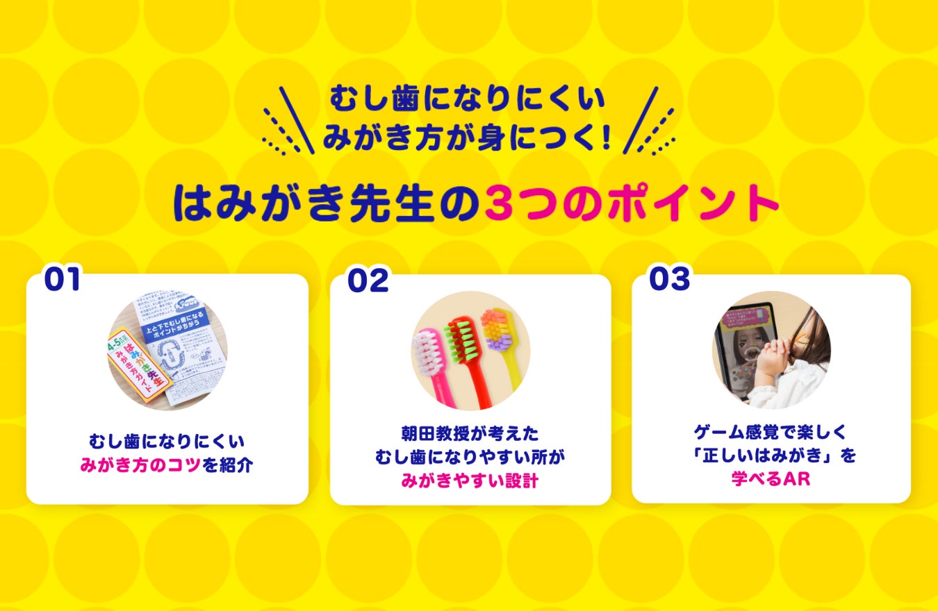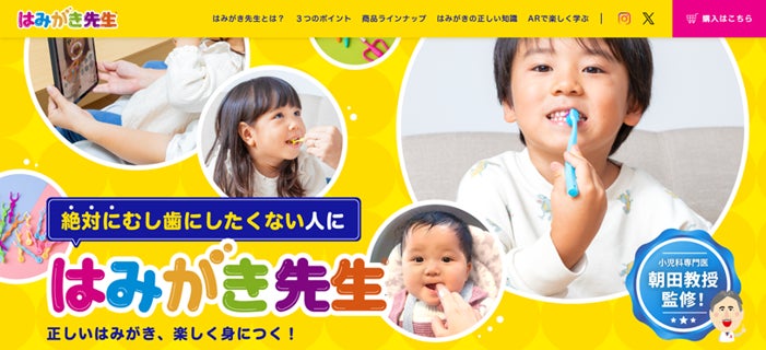 「はみがき先生」は、はみがきの正しい知識とみがき方を学ぶことができ、幼少期から使い続けることで、ママ・パパの悩みや不安を解決します!
