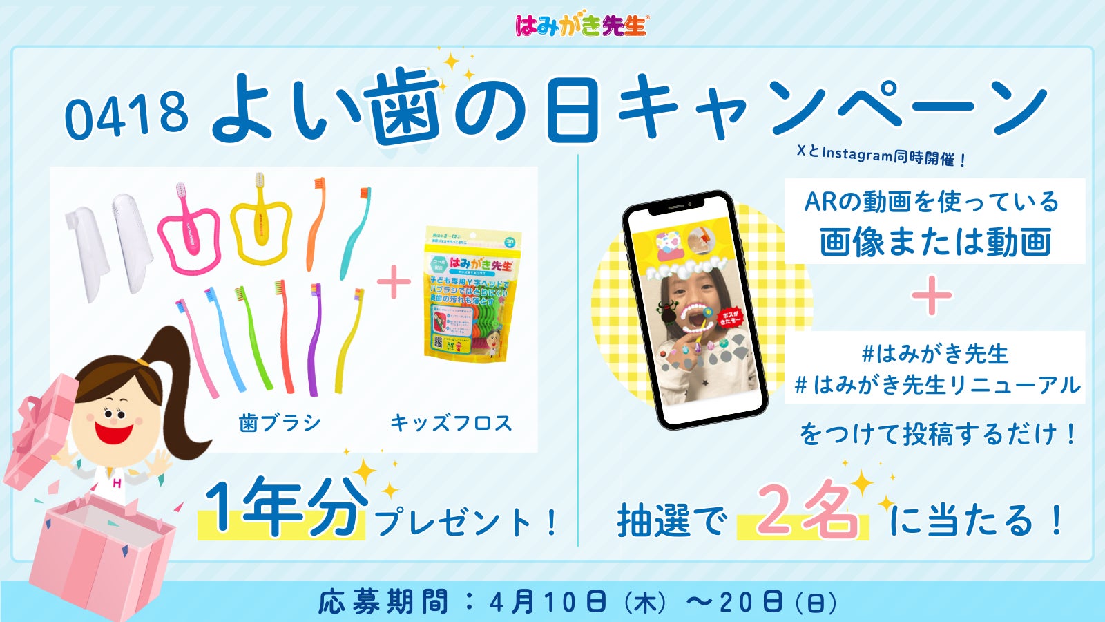 リニューアルを記念して、公式X、Instagramでは4月18日よい歯の日プレゼントキャンペーンを実施中です。抽選で2名の方に1年分のはみがき先生「歯ブラシ」と「キッズ用Y字フロス」をプレゼントいたします。詳しくは公式XまたはInstagramをご確認ください。